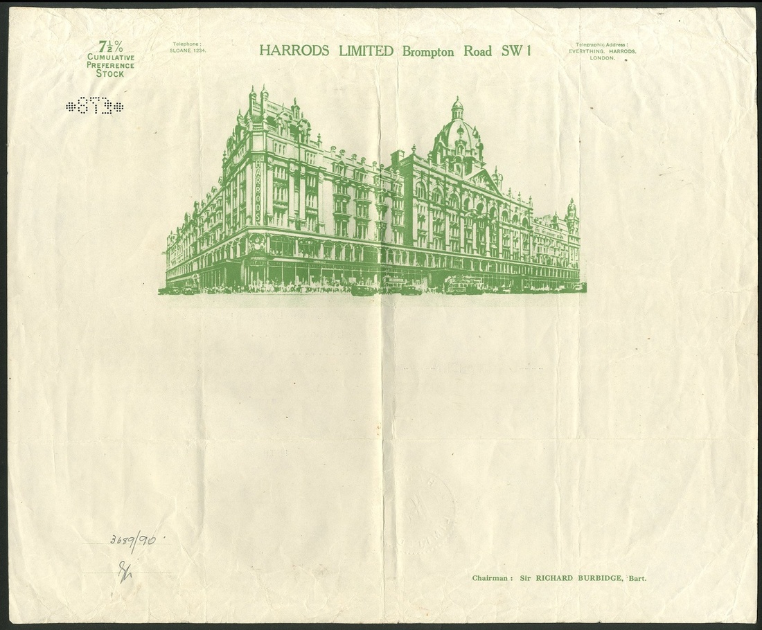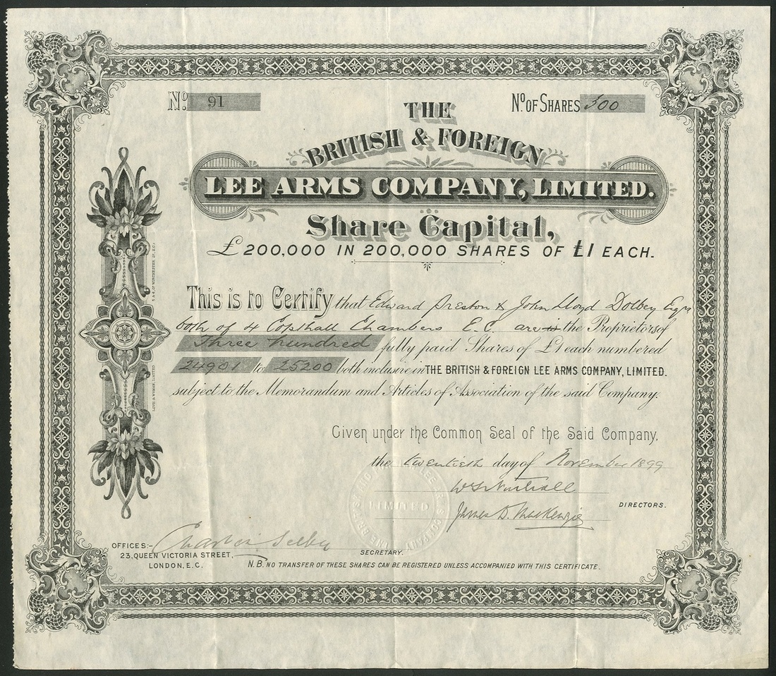 Great Britain: British & Foreign Lee Arms Co. Ltd., £1 shares, [1899], #91, scrollwork left and ornate border, black. This company acquired the rights from the American Lee Arms Company to the patented bolt action rifle. It turned into the Lee-Metford Rifle and then into the better known Lee-Enfield. VF and rare.