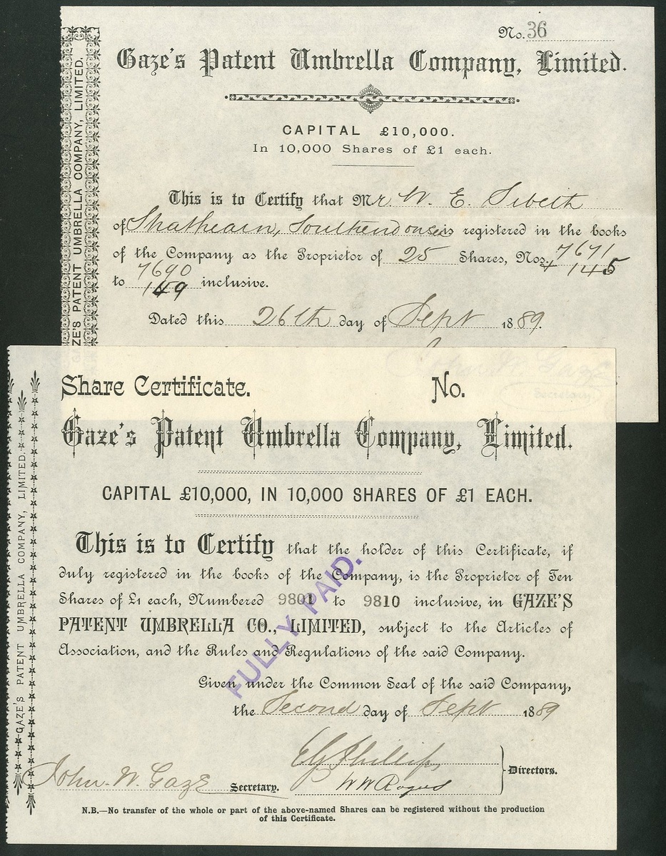 Great Britain: Gaze's Patent Umbrella Company Limited, pair of certificates for £1 shares, both 18[89] but of different design, black printing. EF (2).
