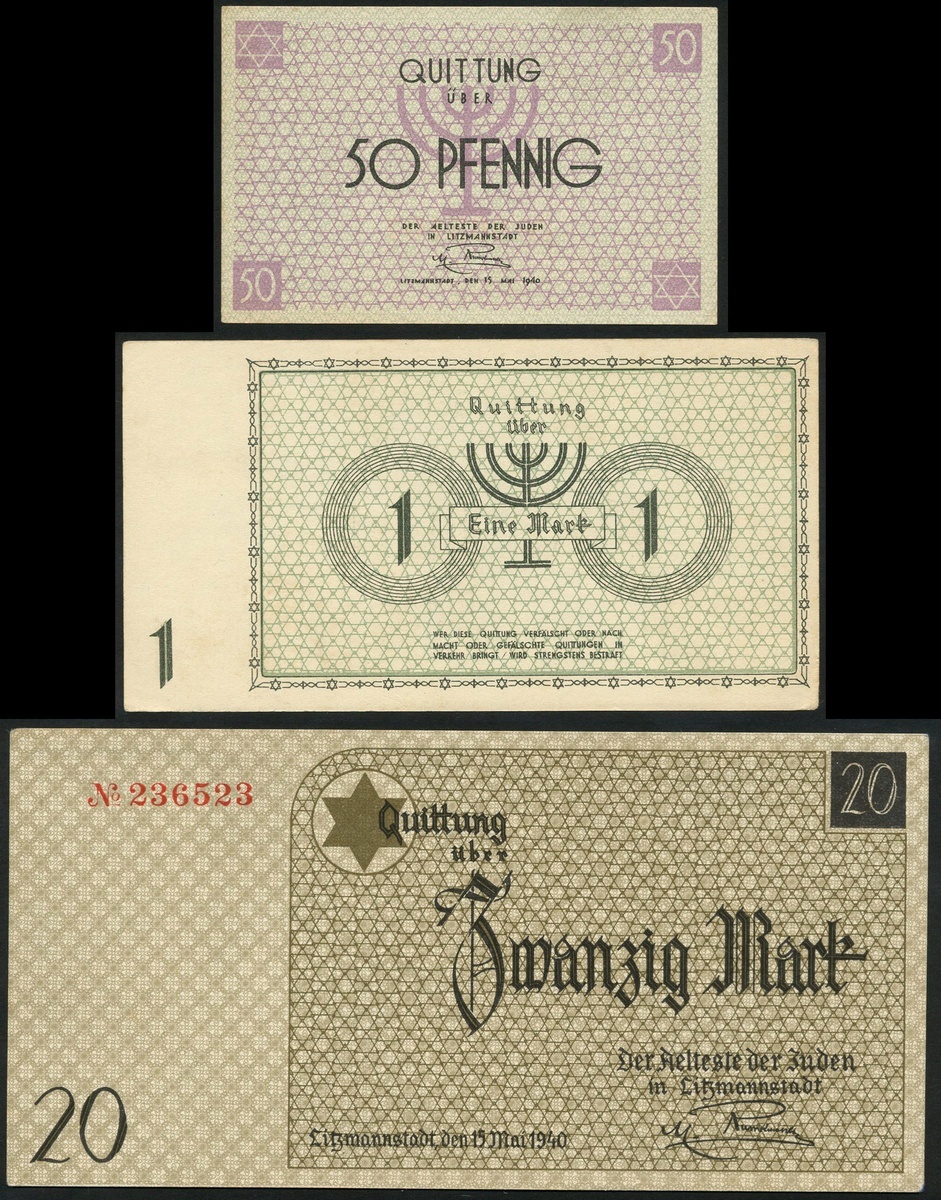 Lodz/Litzmannstadt Ghetto notes, 50 fenigow, 1 mark, 20 mark, 15 May 1940, the 20 mark olive and brown, red serial number 236523,