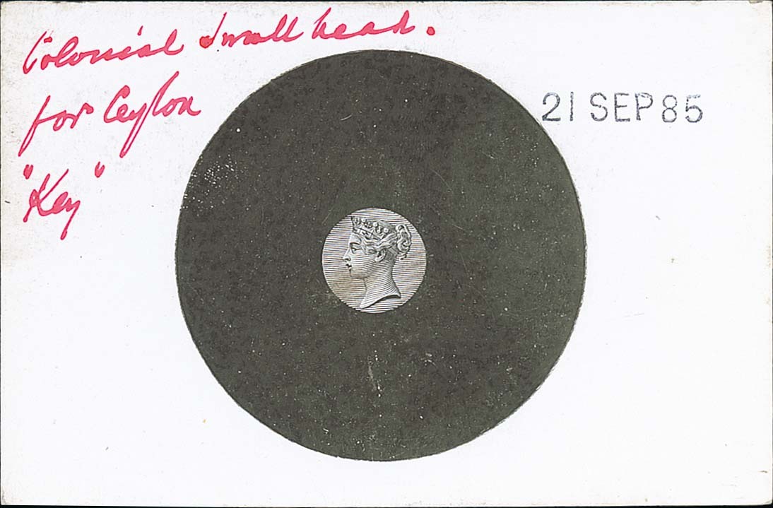 Head with large uncleared circular surround, in black on glazed card (92x60mm.) marked "Colonial Small Head for Ceylon, "Key" in red ink and dated