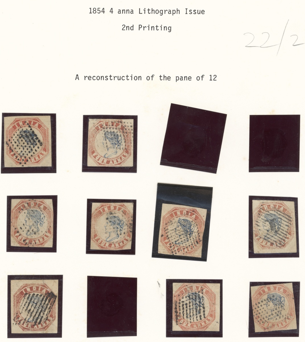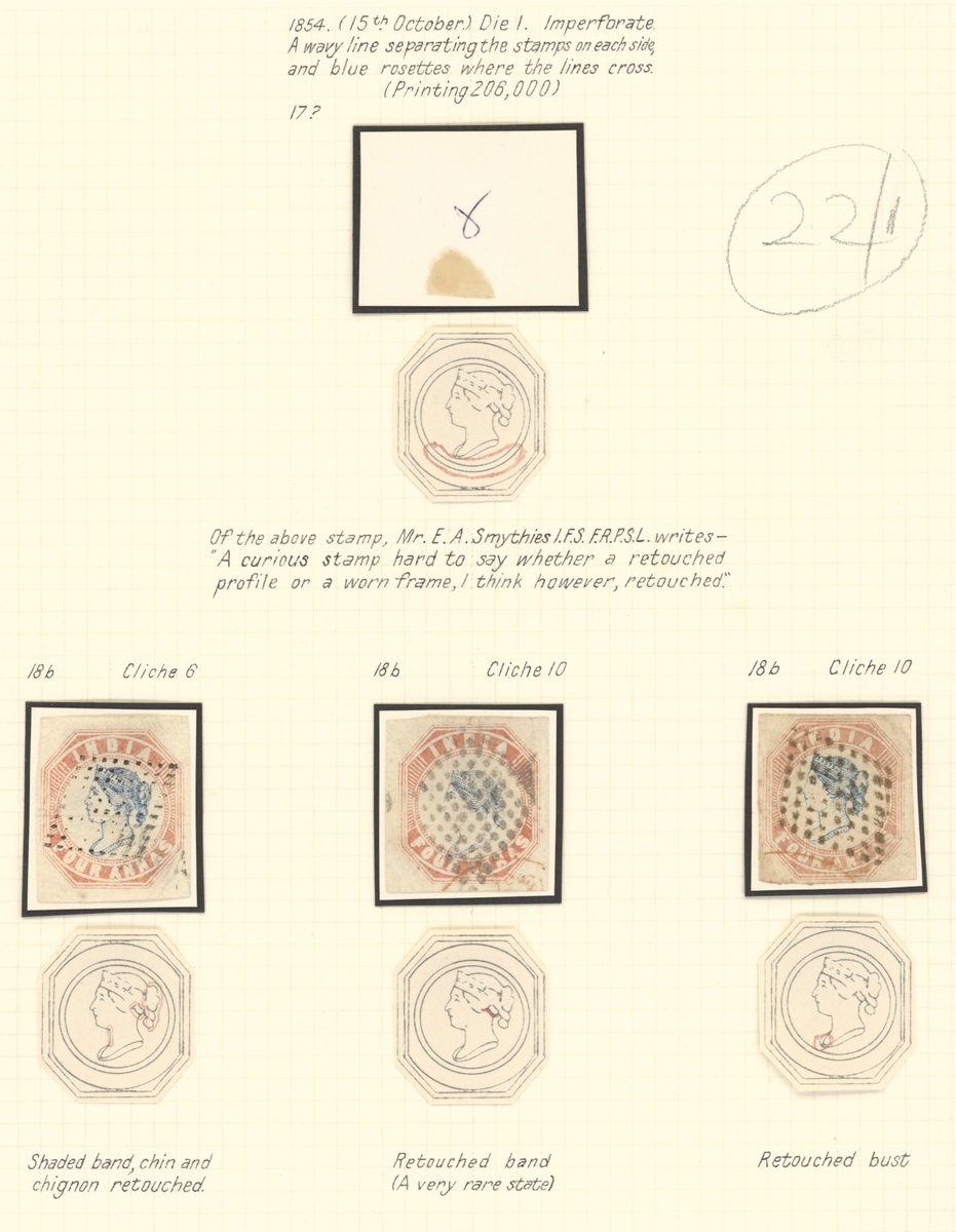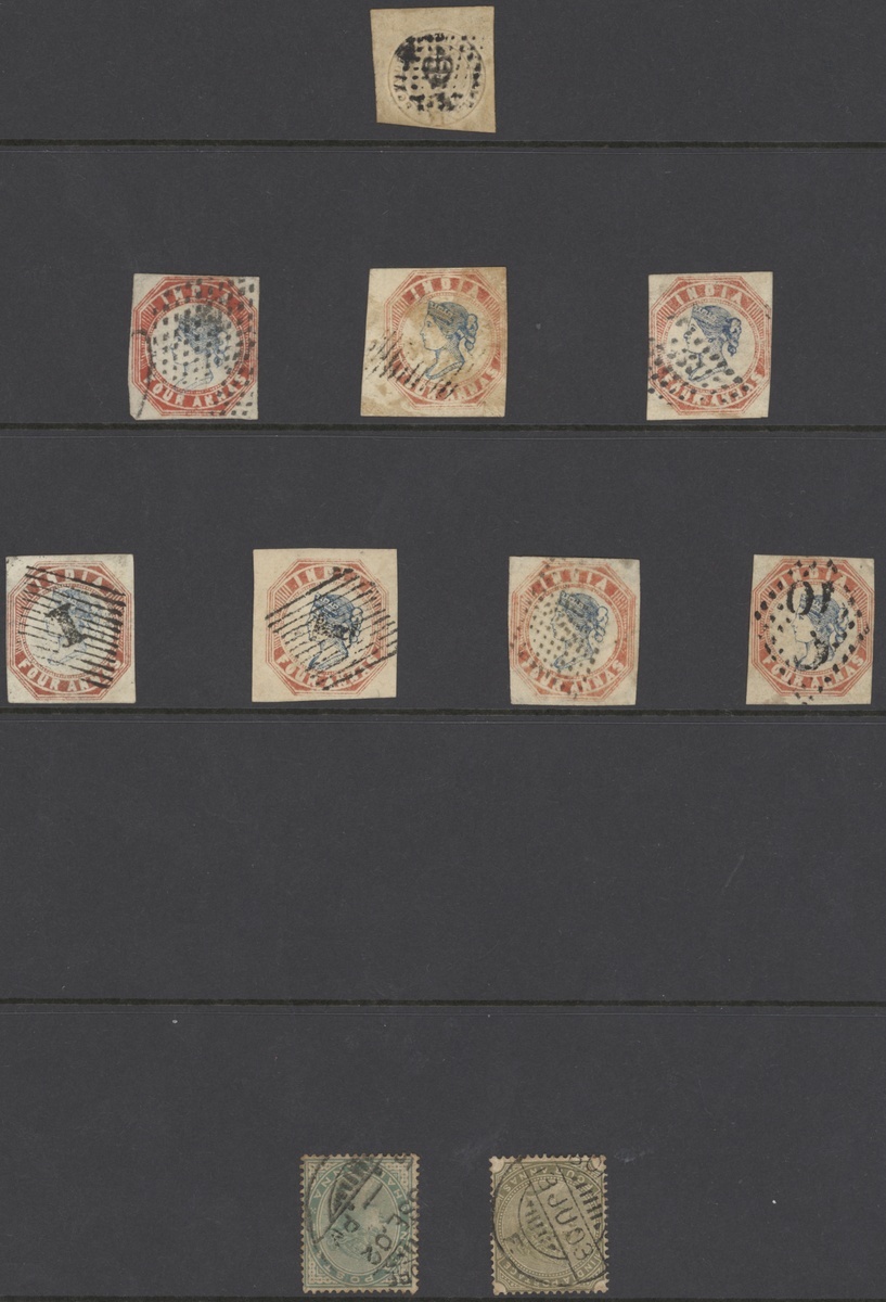 4a. blue and red, selection of twenty, cut square, printings, shades and cancellations, used; also a white Scinde Dawk. Mixed condition
