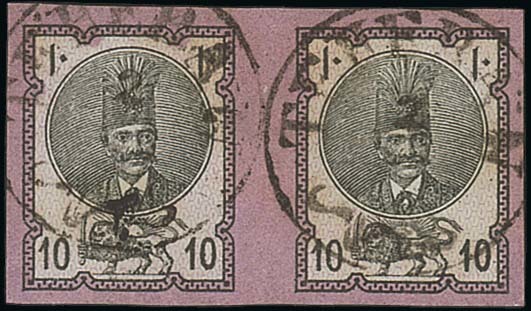 10(sh.) black and bright mauve, imperforate horizontal pair, Teheran cancellation; fine. S.G. 53, Photo