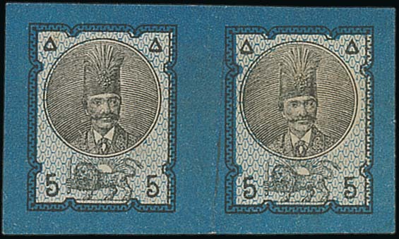 5(kr.) black and blue, imperforate horizontal pair, unused without gum; vertical crease in the margin, fine and rare. S.G. 55. Photo