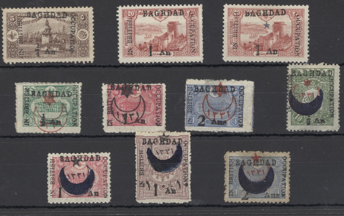 Surcharged on Turkey ¼a. on 5pa. dull purple, 1a. on 20pa. red, overprinted with five pointed Star 1a. on 20pa. red, overprinted with six pointed star with date within crescent ½a. on 10a. green 1a. on G.P.O. Constantinople 20pa., 2a. on G.P.O. Constantinople 1pi. ultramarine, overprinted with date between crescent ½a. on 10pa., 1a. on G.P.O. Constantinople 10pa., 1a. on 10pa. on 20pa. claret and 2a. on G.P.O. Constantinople 1pi. ultramarine, part original gum or unused; some faults but good appearance and scarce. S.G. 2, 5, 7, 13, 14, 19, 21, 21, 24, £5,750