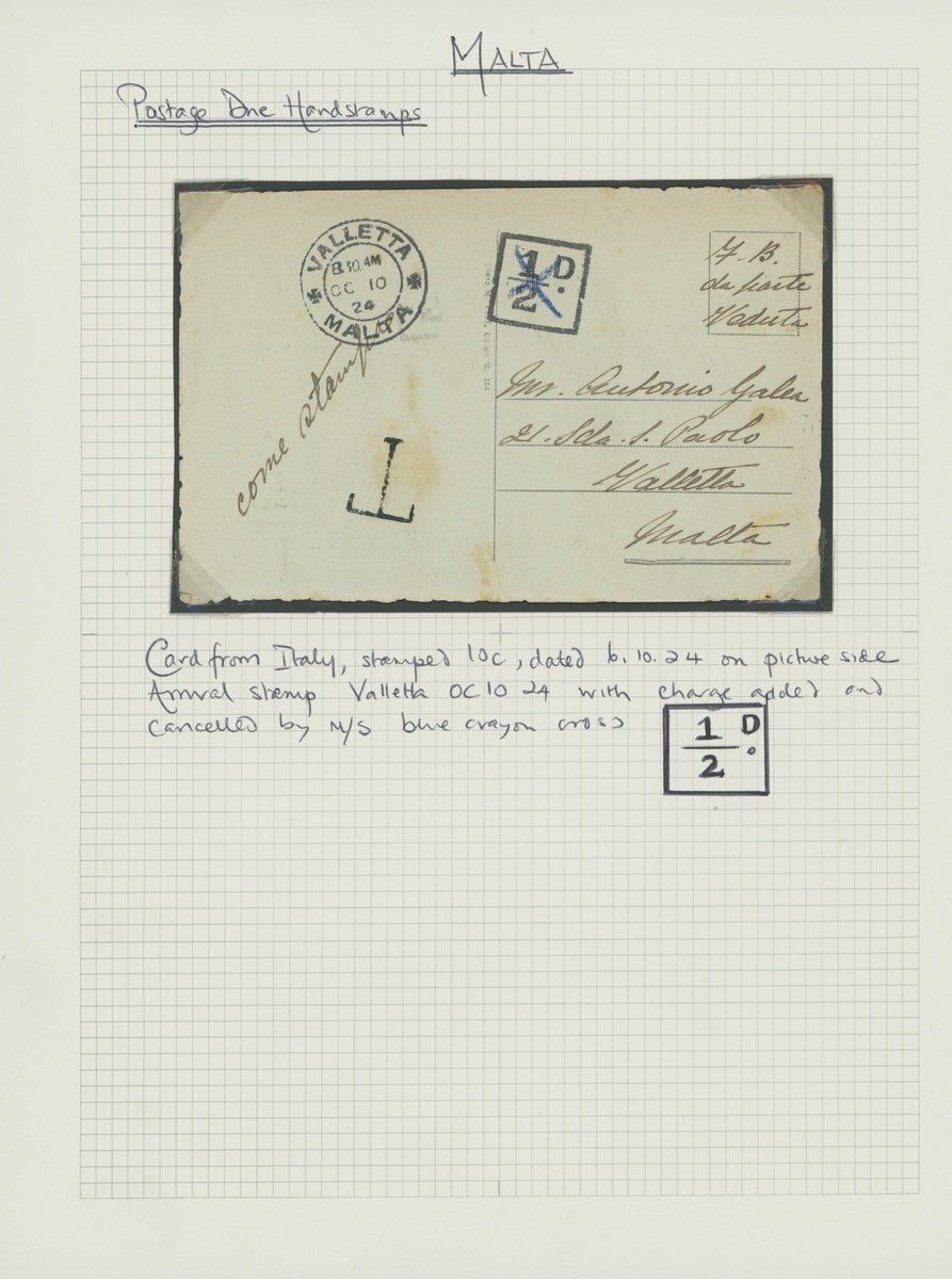 1923-27 envelopes (2, one Official) and picture postcards (4), all showing boxed tax handstamp for ½d. (2, one deleted with blue crayon), 1d., 1½d., 2d. and 2½d. (in red on Official cover) and all except the Official cover with handstruck "T"; condition a little mixed