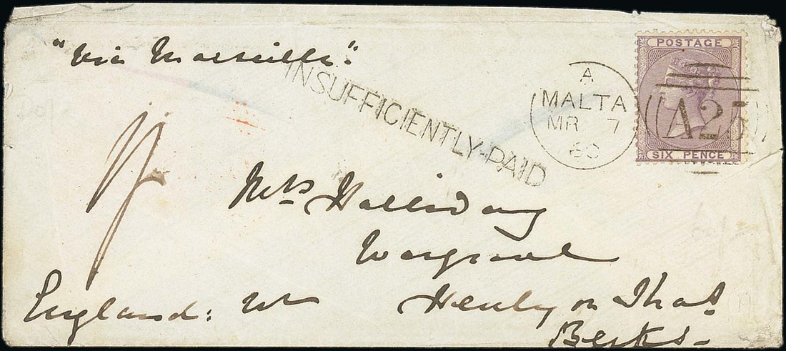1860 (7 Mar.) envelope (small tear at right) to Henly on Thames, marked "Via Brindisi", bearing 1855 6d. clearly tied by "A25" duplex and showing fine straight-line