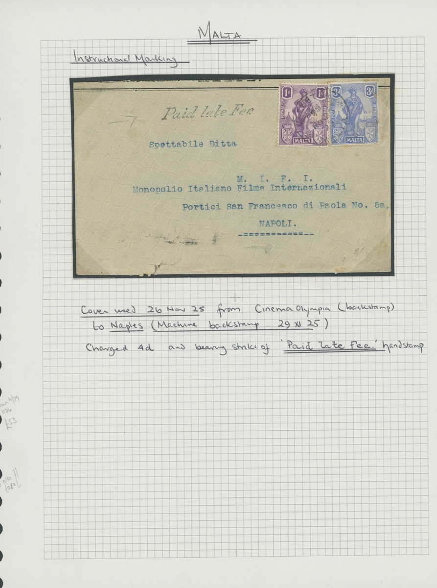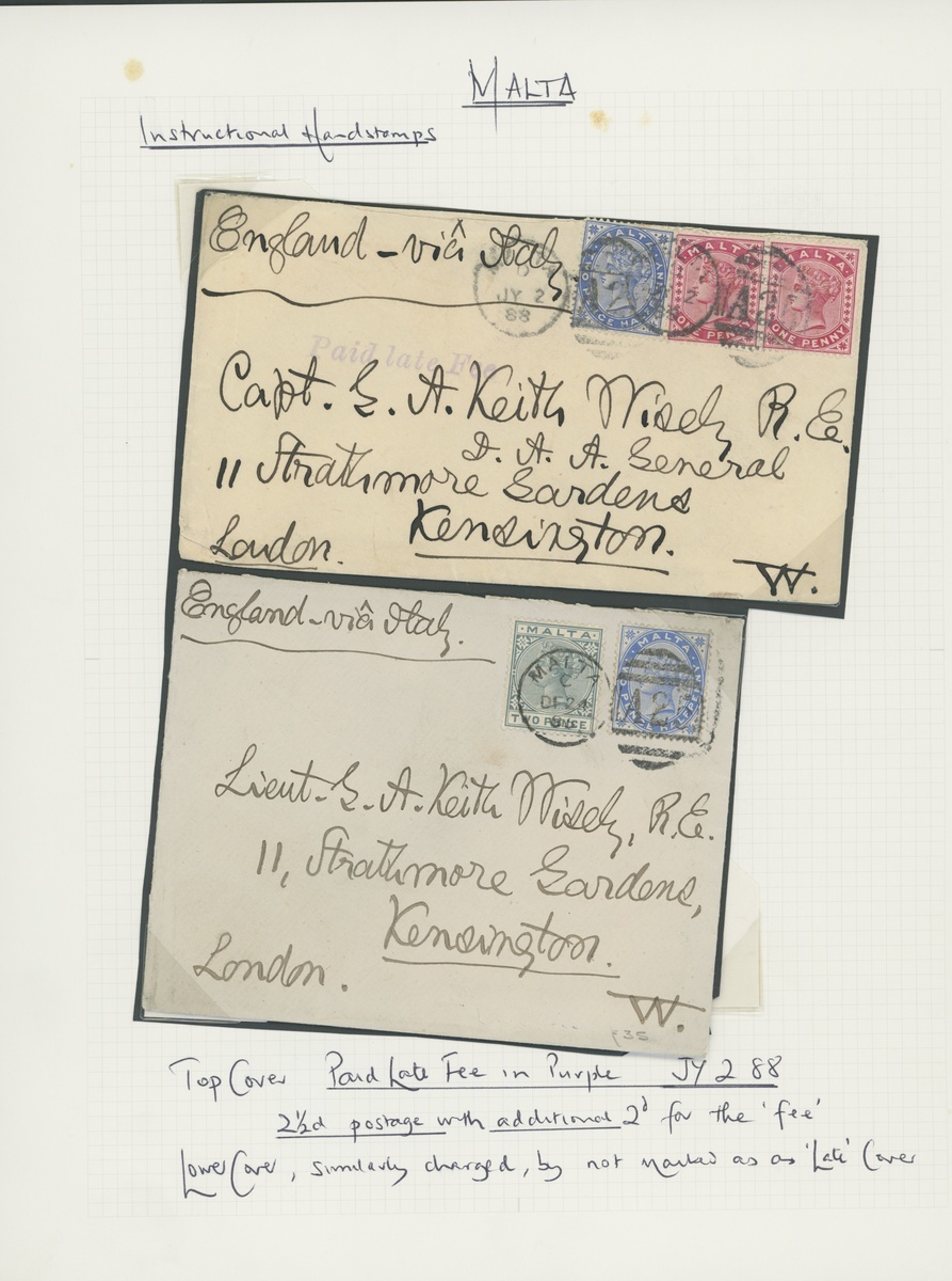 1885 (24 Dec.) and 1888 (2 July) envelopes from the same correspondence to London, both franked at 4½d. (different make-ups) with the latter showing straight-line "Paid late Fee" h.s. in violet; and 1925 (26 Nov.) envelope to Naples, franked at 4d. and showing black "Paid late Fee" h.s. in a different type