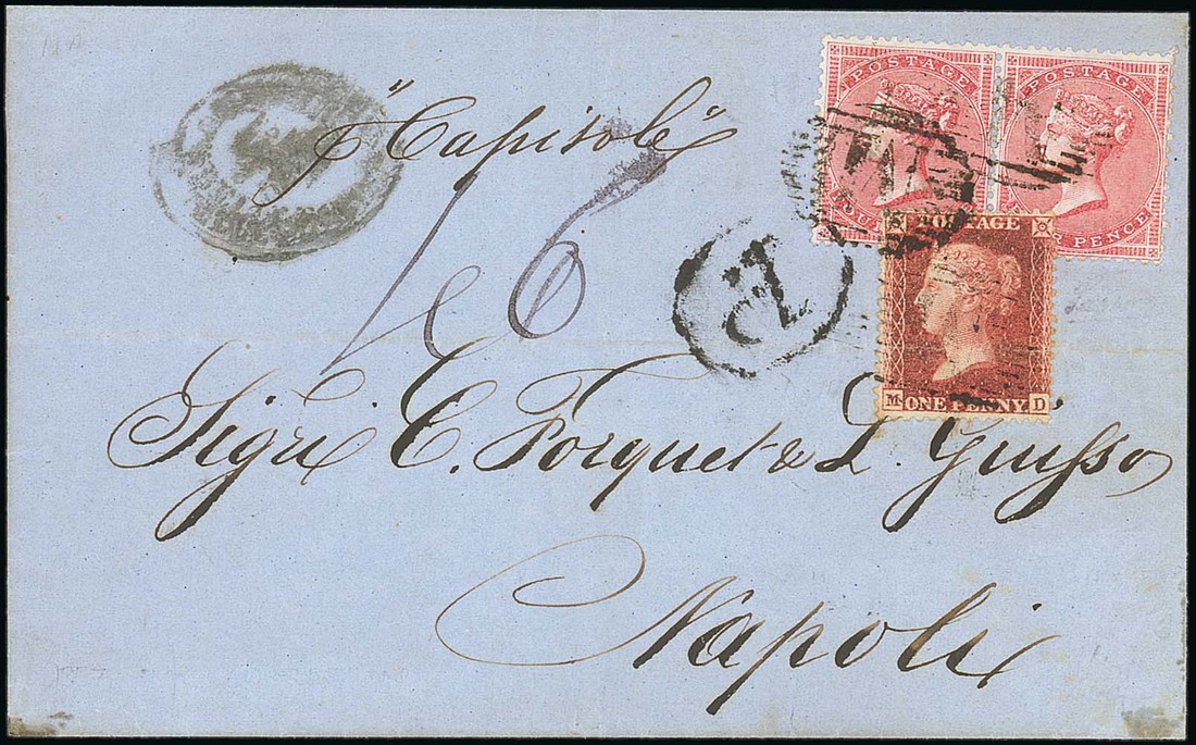 1857 (27 Sept.) treble rate entire to Naples, bearing 1857 4d. pair with LC14 1d. (crossed by horizontal filing crease) affixed partially over the pair, clearly tied, showing oval-framed
