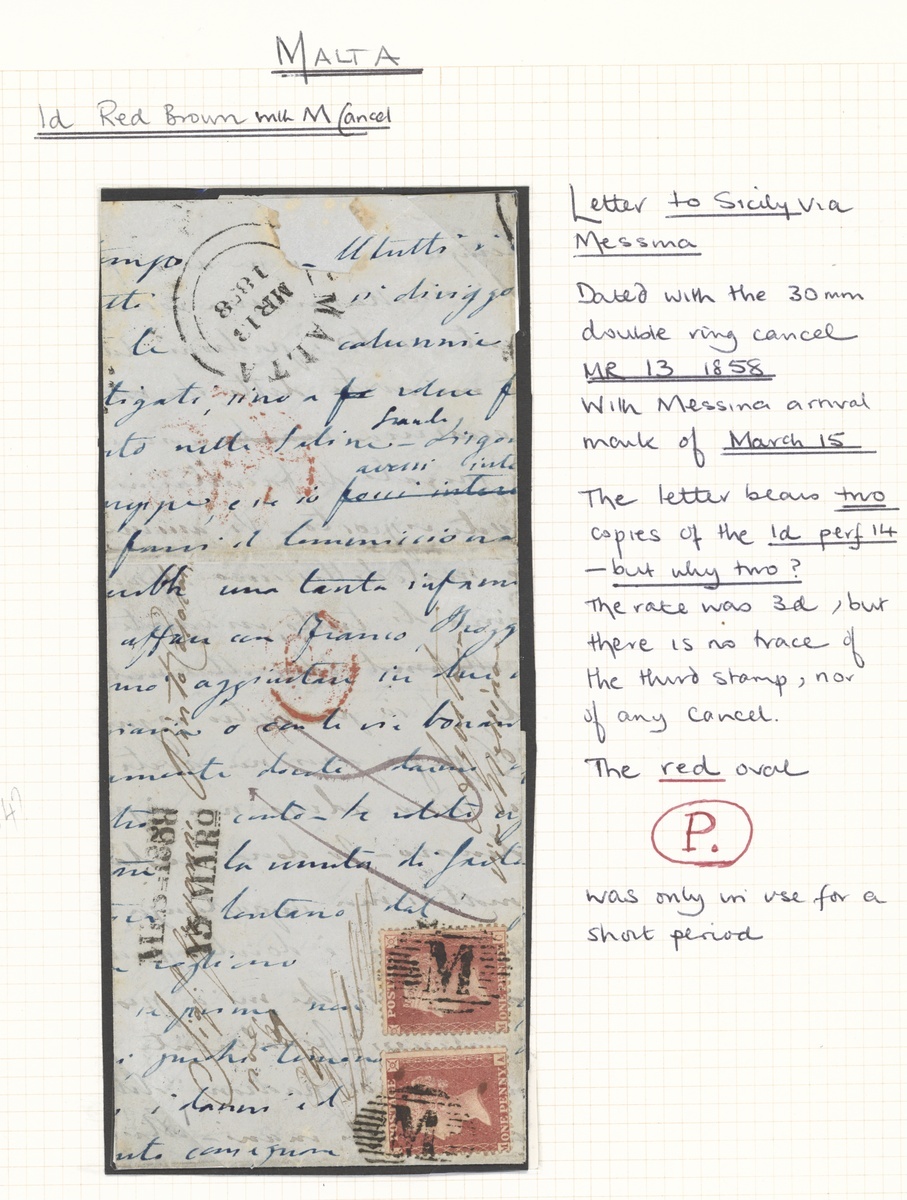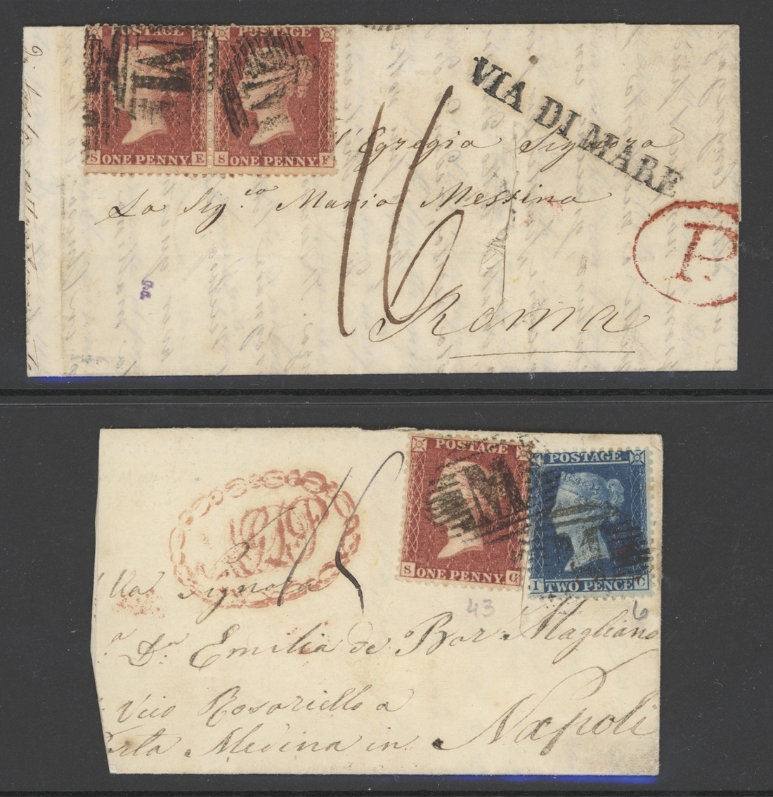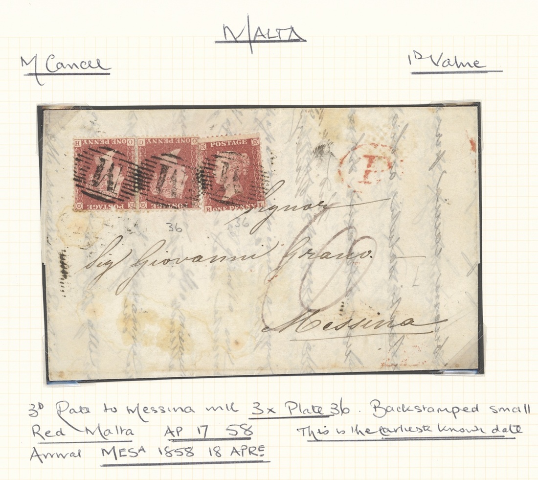 1858 (17 Apr.) entire letter (light stains) to Messina, bearing 1857 LC14 1d. Pl. 36 pair and single, each centrally cancelled and showing oval-framed