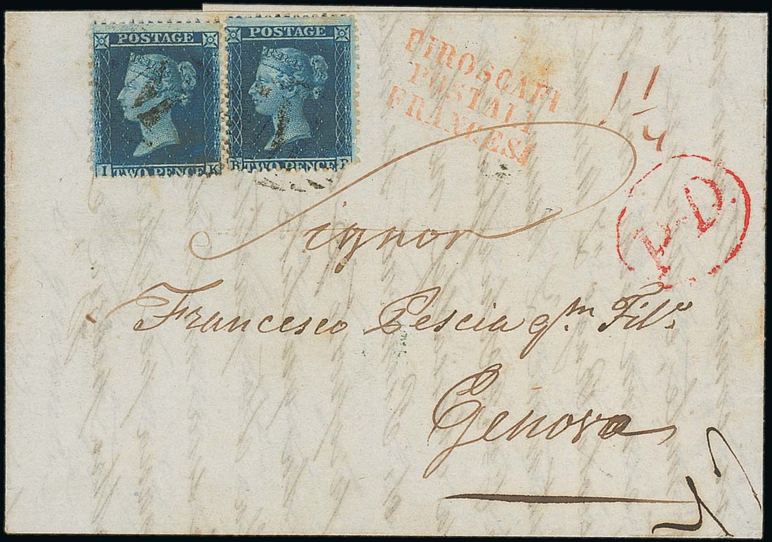 1858 (Oct.) entire letter to Genoa, bearing 1855 LC14 2d. (2), both lightly cancelled, showing oval-framed