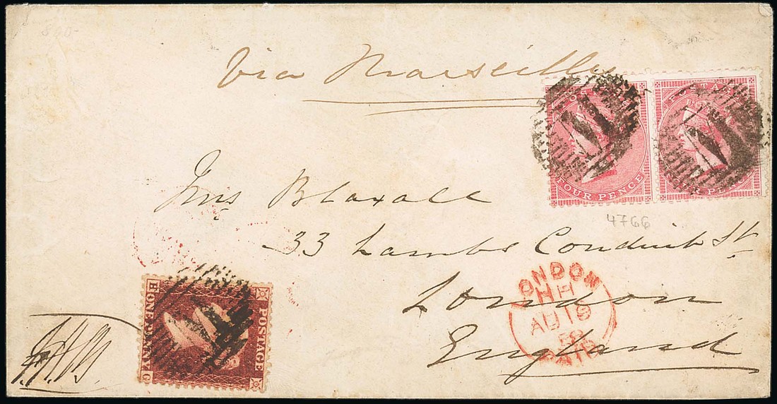 1858 (11 Aug.) envelope to London, bearing 1857 LC14 1d. and 4d. pair, each clearly cancelled, showing arrival c.d.s. with despatch datestamp on reverse. Neat and attractive. Photo