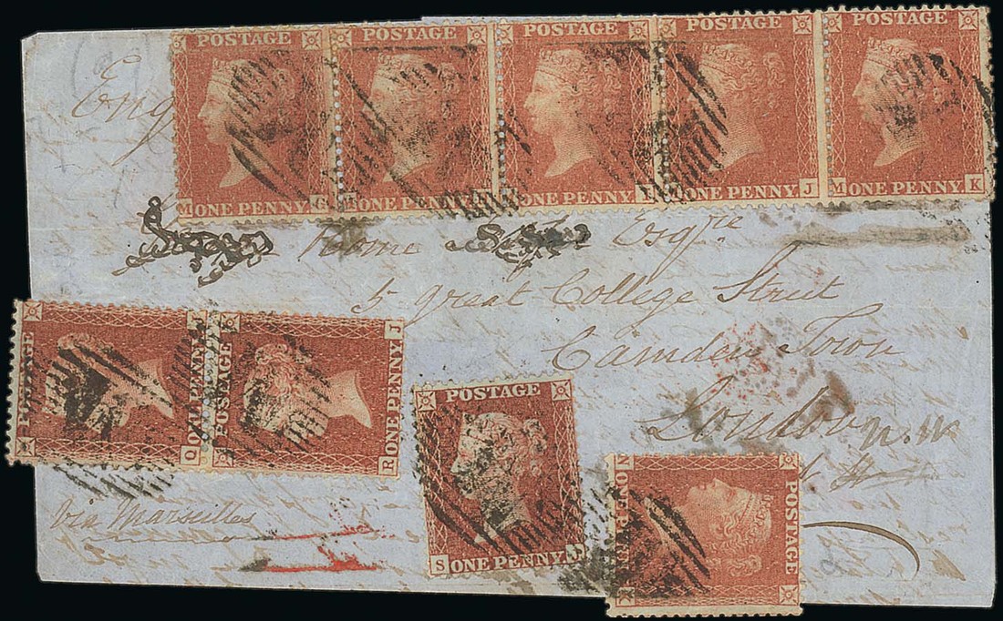 1859 (Jan.) envelope (faults on reverse) to London, bearing nine 1857 LC14 1d. comprising a strip of five, vertical pair and singles (2), cancelled with poor to good strikes and showing despatch and arrival datestamps on reverse. An amazing franking. Photo