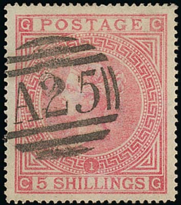 1867 5/- rose Pl. 1, CG, and 1874 5/- pale rose Pl. 2, BF, both neatly cancelled "A25", the former with light corner crease not affecting fine appearance. S.G. Z85, £850. Photo