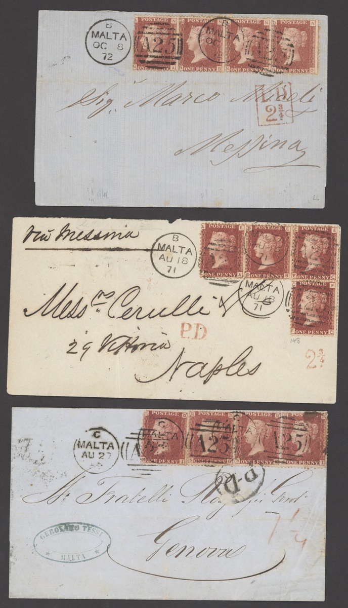 1859 (22 Aug.) entire to Genoa bearing 1857 LC14 1d. strip of three and a single, showing oval-framed