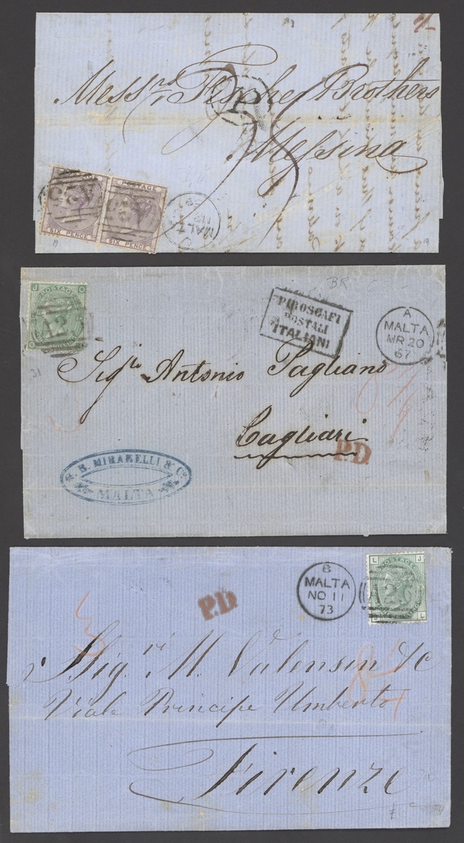 1867 (20 Mar.) treble rate entire to Cagliari, bearing 1/- Pl. 4 tied by "A25" obliterator, showing Malta c.d.s., framed