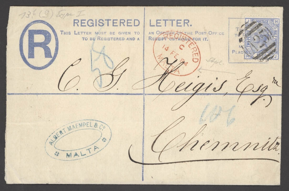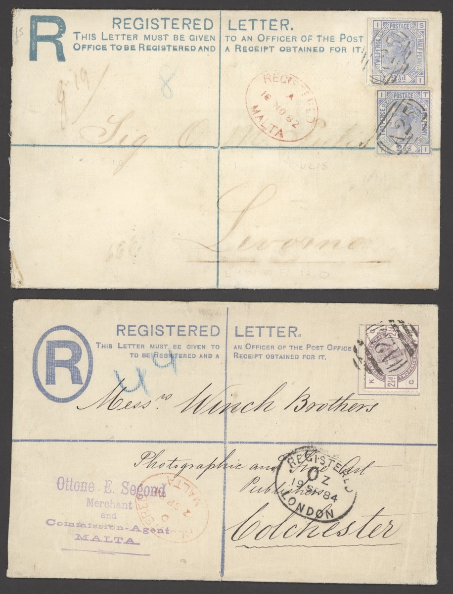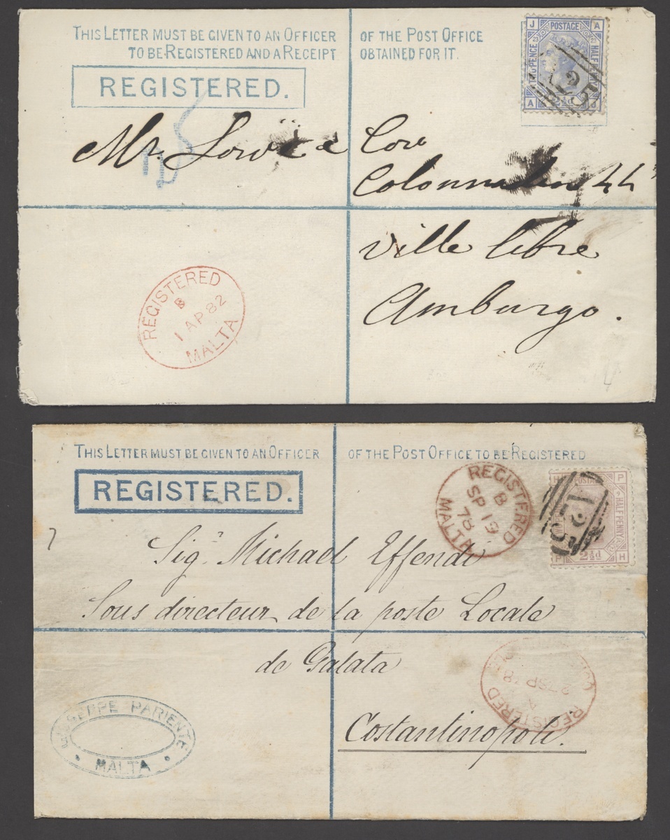1878 (Sept.) - 84 2d. registered envelopes (7) to Constantinople, Germany (3) and UK uprated with 2½d. rosy mauve Pl. 9, 2½d. blue Pl. 22 (2), 23 (2) and 2½d. lilac, plus one at double rate with 2½d. blue Pl. 22 (2), the first (flap missing) with red