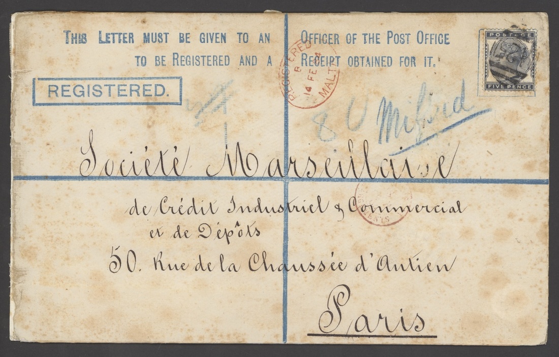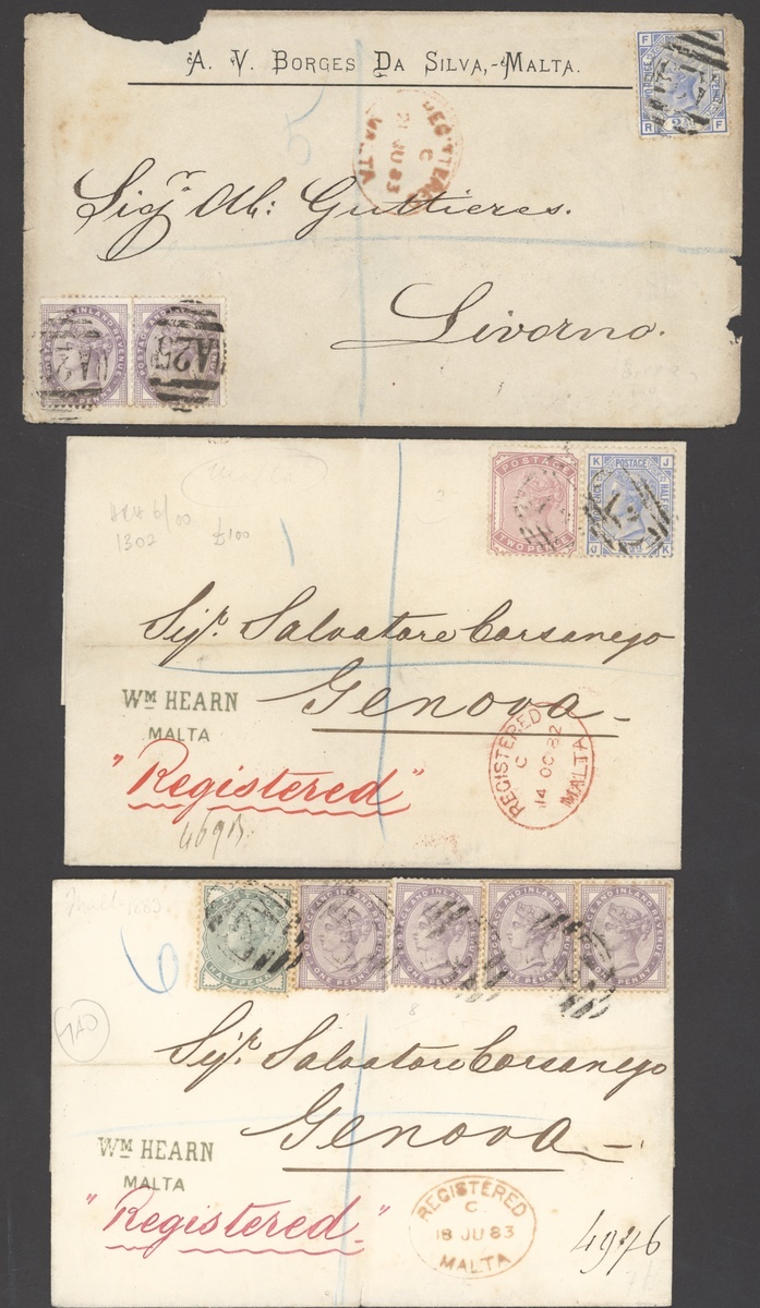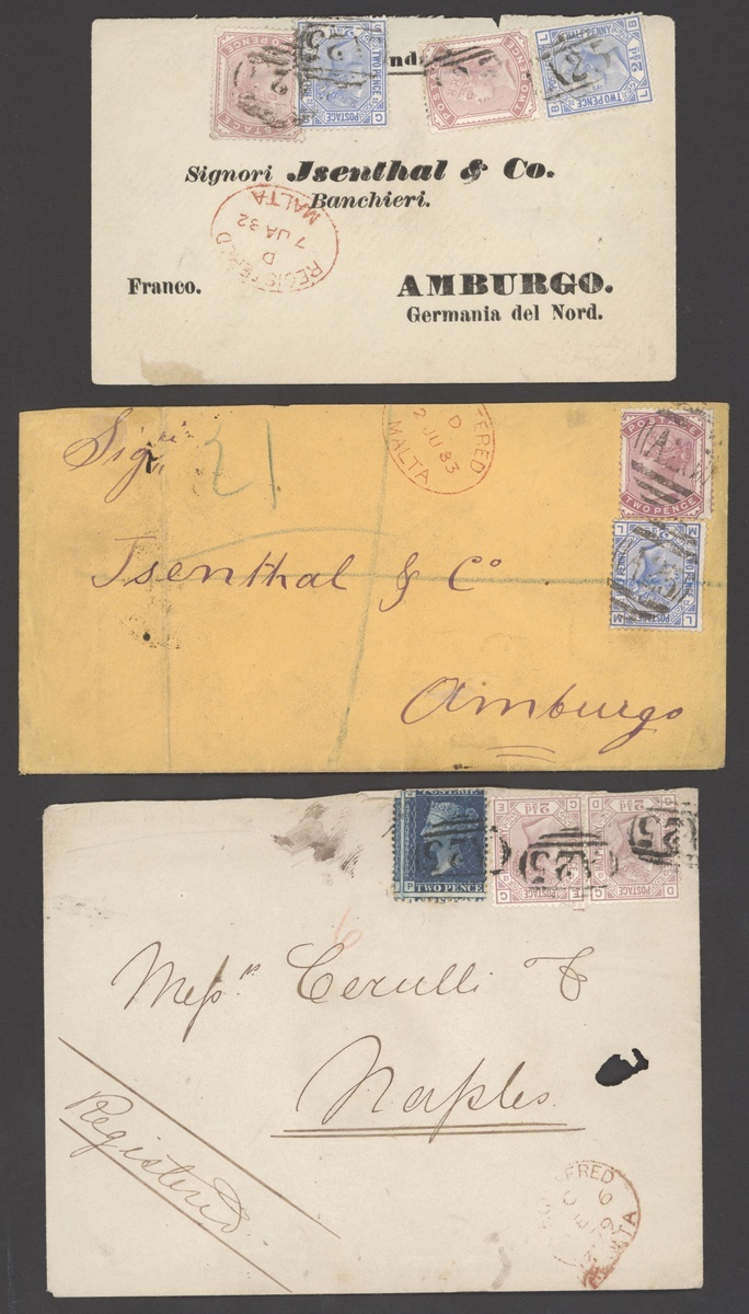 1879-83 envelopes (4) to Germany and Italy (3), two with 2d. pale rose + 2½d. blue, the others with ½d. green (stained perfs) + 1d. lilac (4, stained perfs) and 1d. lilac pair + 2½d. blue, plus double rate envelopes (3) to Germany with 2d. pale rose (2) + 2½d. blue (2), to Naples with 2d. blue + 2½d. rosy mauve pair and large 2d. registered envelope (stained) to Paris with 5d. indigo, one with red
