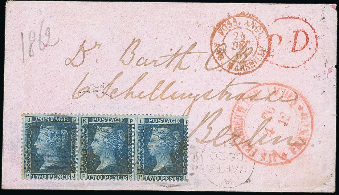 1861 (20 Dec.) envelope to Berlin, bearing 1858 2d. Pl. 9 strip of three tied by light "A25" duplex, showing oval-framed
