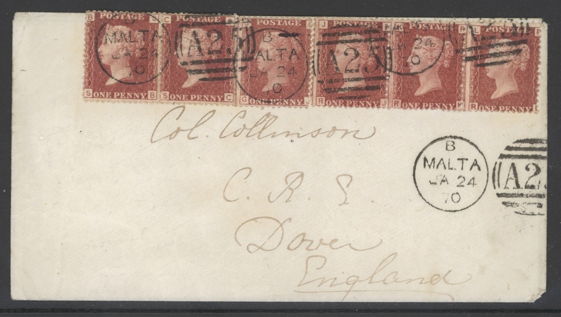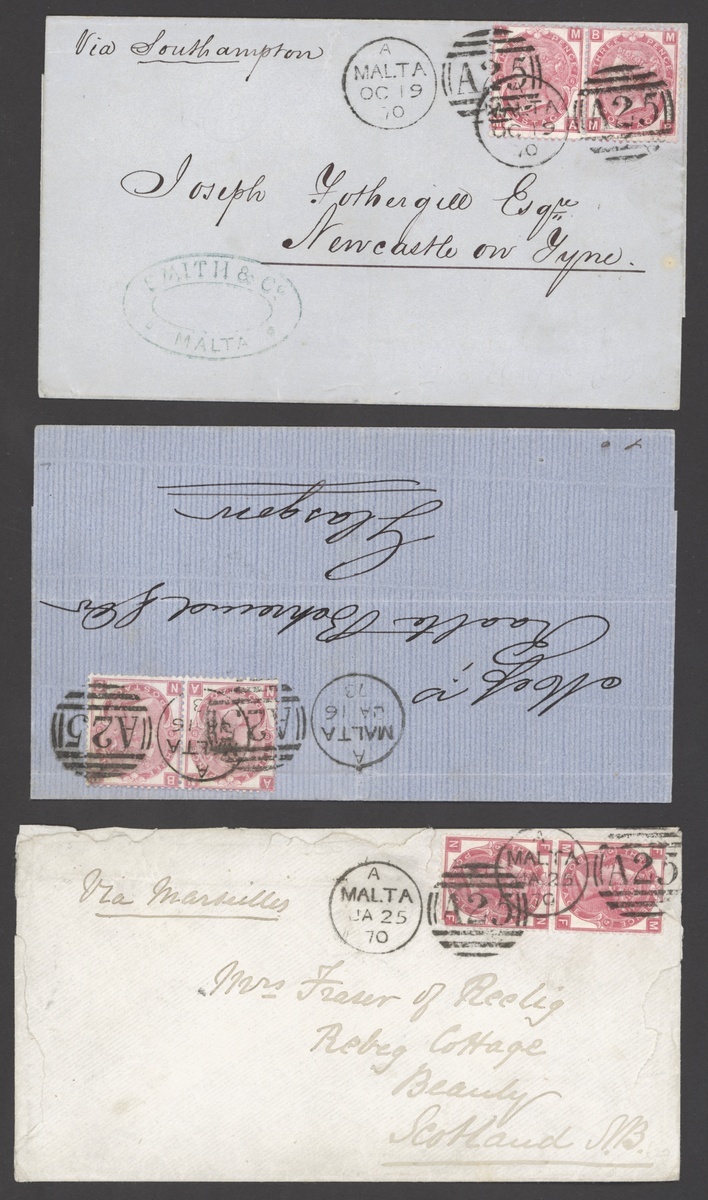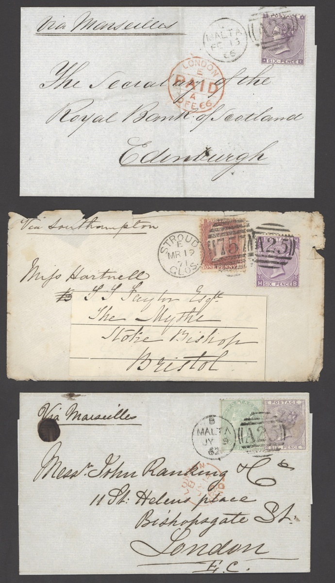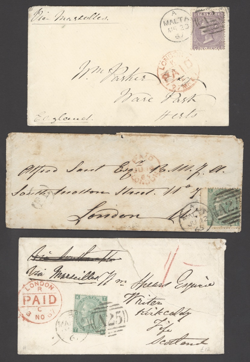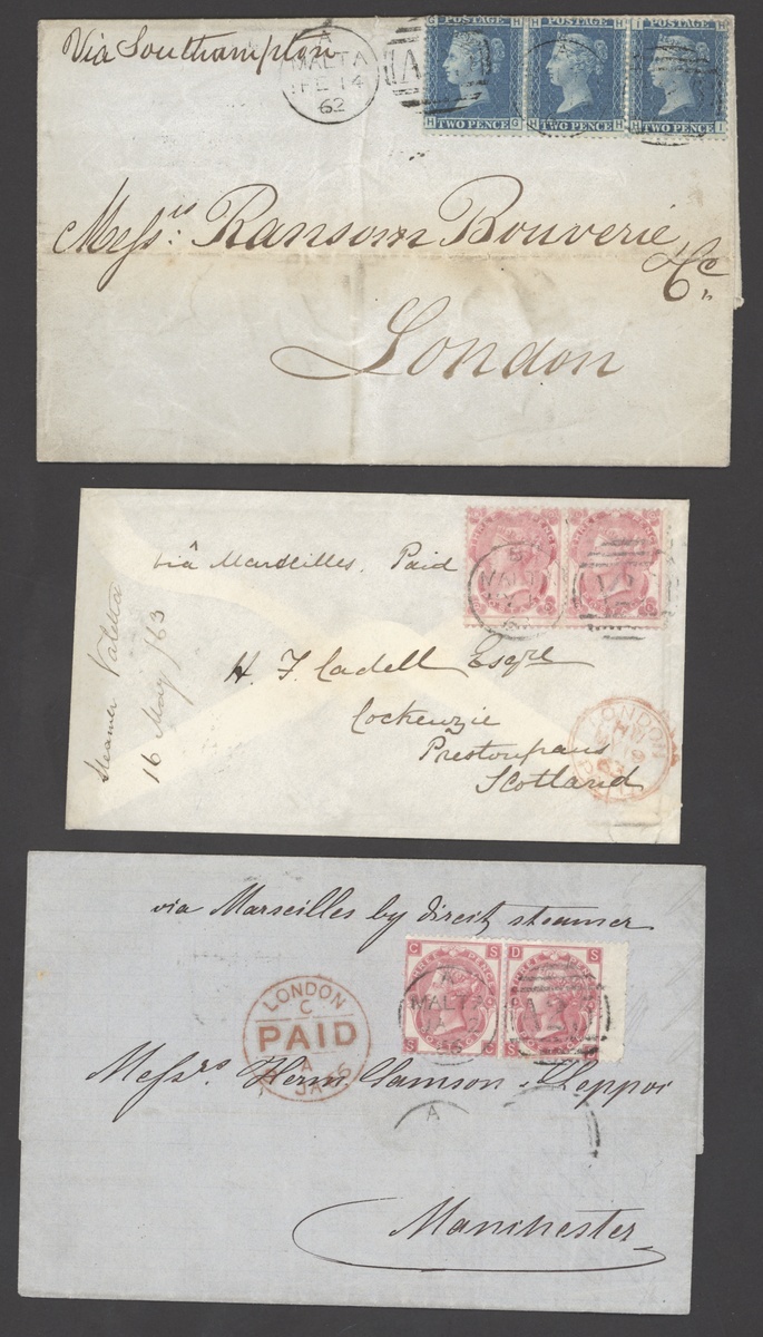 1862 (14 Feb.) entire letter (discoloured along horizontal filing crease) to London, marked "Via Southampton" and bearing 2d. Pl. 9 strip of three; 1862 (9 July) treble rate entire to London bearing 6d. and 1/-; 1863 (May) envelope to Scotland, marked "via Marseilles", bearing 3d. pair; 1865 (12 June) double rate envelope (stained) to London bearing 1/- Pl. 4 and showing light circular-framed