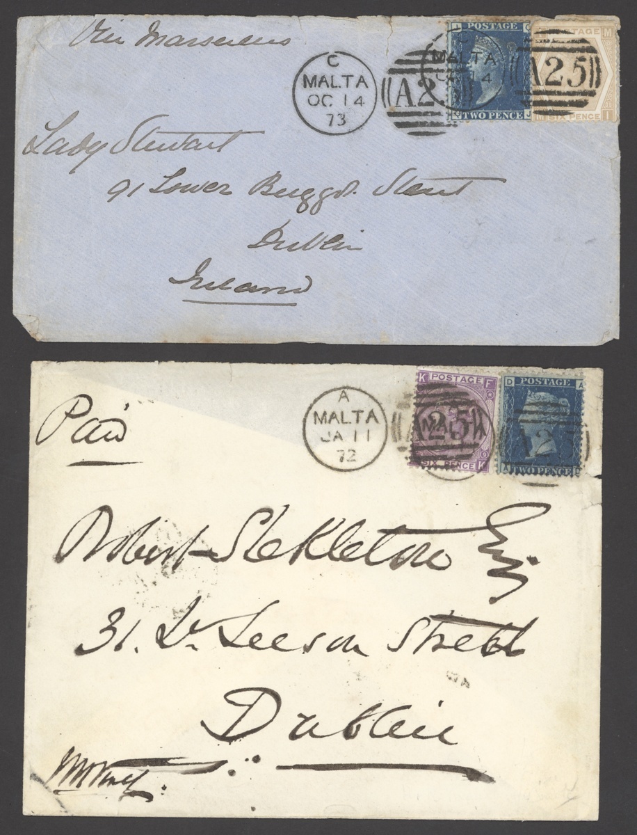 1872 (11 Jan.) and 1873 (14 Oct.) envelopes (former with flap missing) to Dublin, the former bearing 2d. Pl. 8 and 6d. violet Pl. 9, the latter bearing 2d. Pl. 14 (some stained perfs at top) and 6d. buff Pl. 11 (faults at top), both clearly tied by "A25" duplex and showing, on reverse,