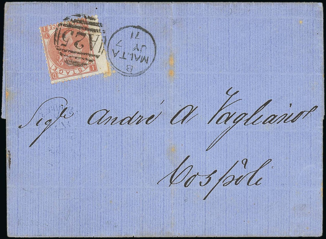 1871 (7 July) entire to Constantinople, bearing 1867 10d. (affixed inverted at upper left) clearly tied by "A25" duplex and showing, on reverse, British P.O. arrival c.d.s. in blue; some staining around perfs. Photo