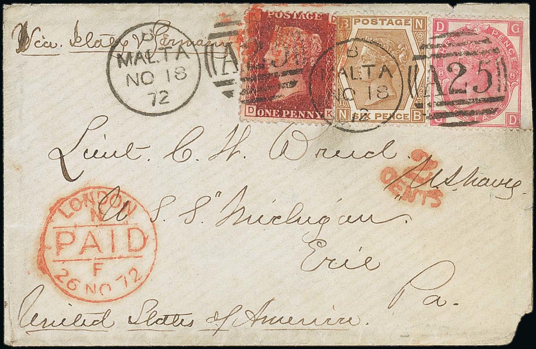 1872 (18 Nov.) envelope addressed to an Officer on U.S.S. Michigan at Erie, marked "Via Italy & Panama", bearing 1864-79 1d. Pl. 127, 1867 3d. Pl. 8 and 1872 6d. Pl. 11, all clearly tied by "A25" duplex, showing London Paid transit c.d.s. (26.11) and "2/cents" accountancy h.s., both in red; the envelope with small piece missing from lower right corner. A neat and attractive franking. Photo