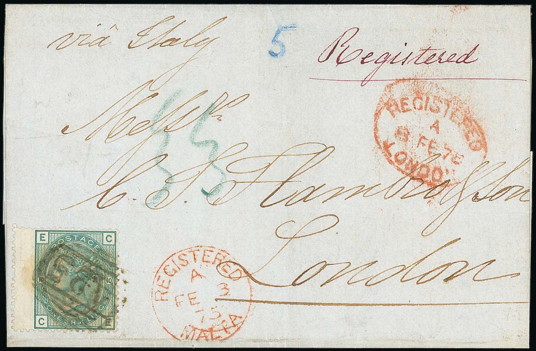 1875 (3 Feb.) entire to London, marked "via Italy", bearing 1873 1/- Pl. 10, centrally cancelled and showing