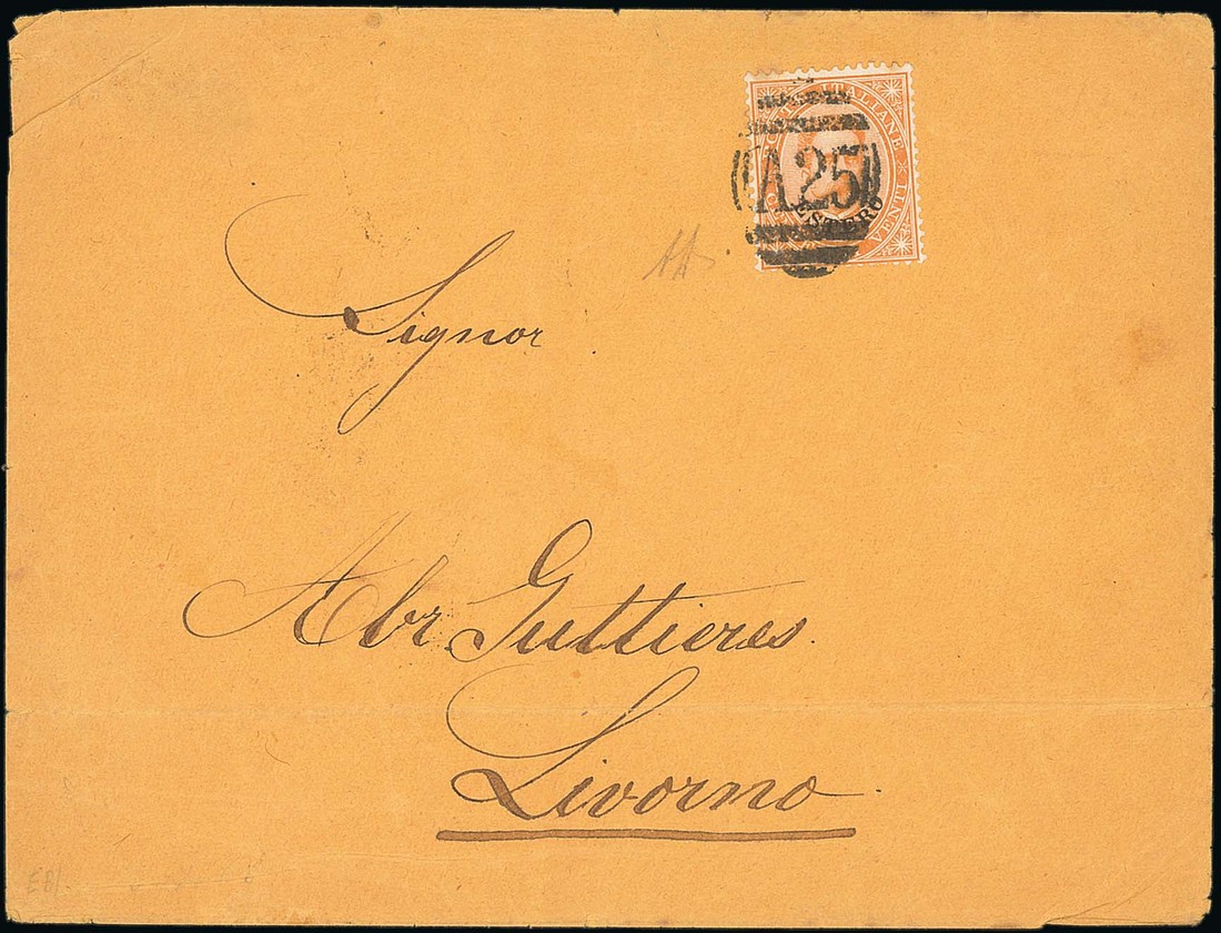 1888 (3 Sept.) envelope from Tripoli to Livorno, bearing Italian P.O. in Turkish Empire 1878 20c. tied by clear "A25" obliterator and showing, on reverse, Malta, Naples and arrival datestamps; the envelope with some creases. Photo