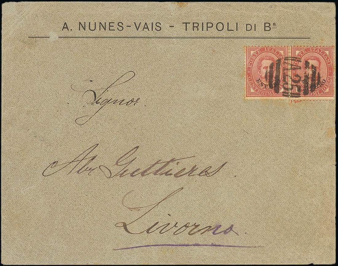1889 (9 Sept.) envelope from Tripoli to Livorno, bearing Italian P.O. in Turkish Empire 1881 20c. pair sharing fine "A25" obliterator and showing, on reverse, Malta, Naples and arrival datestamps; the envelope with some faults on reverse. Photo