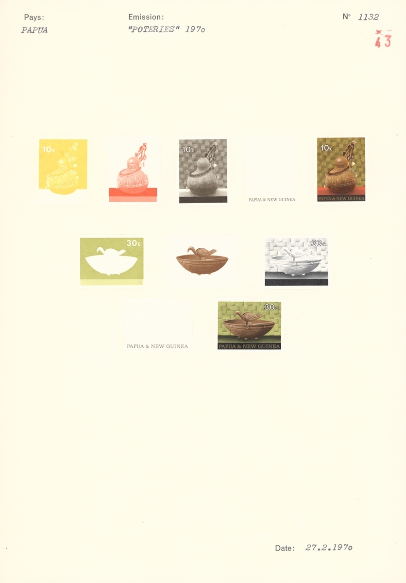 1970 (Oct.) Native Artefacts set of four comprising four colour separations and complete design for each value, plus 10c. unadopted colours and unissued 60c. (design of 30c.) with four colour separations and complete design of both values, all affixed to two archival pages.  (30 proofs)