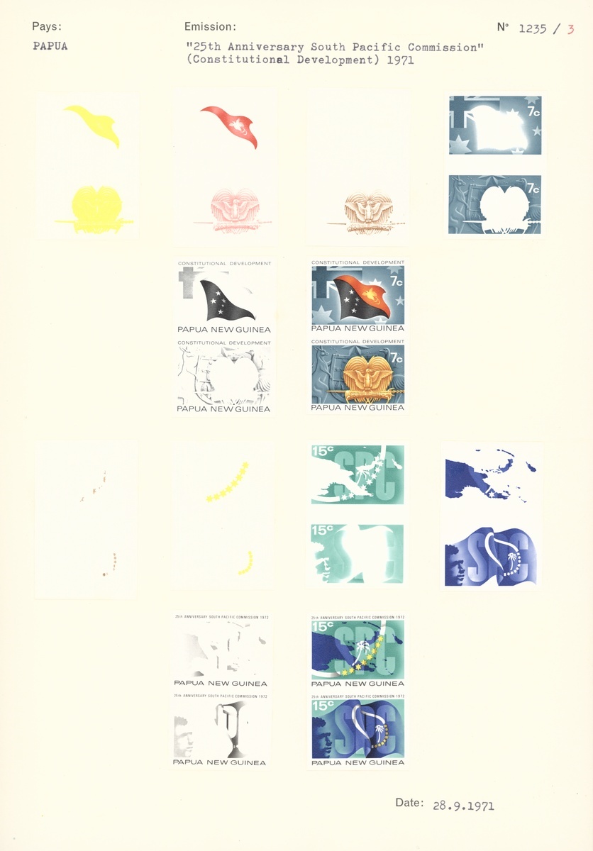1972 (Jan.) Constitutional Development 7c. and South Pacific Commission 15c. se-tenant pairs comprising five colour separations and complete design for both. (12 proofs)