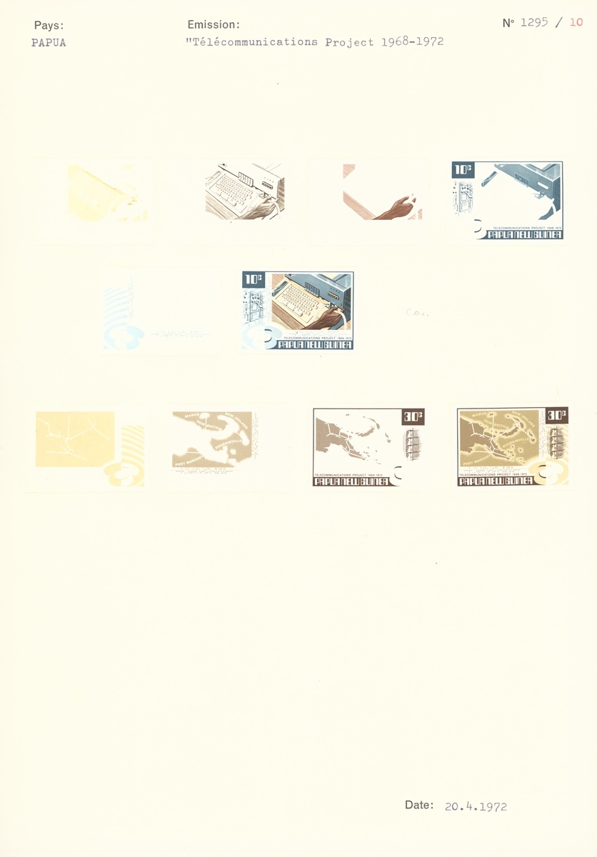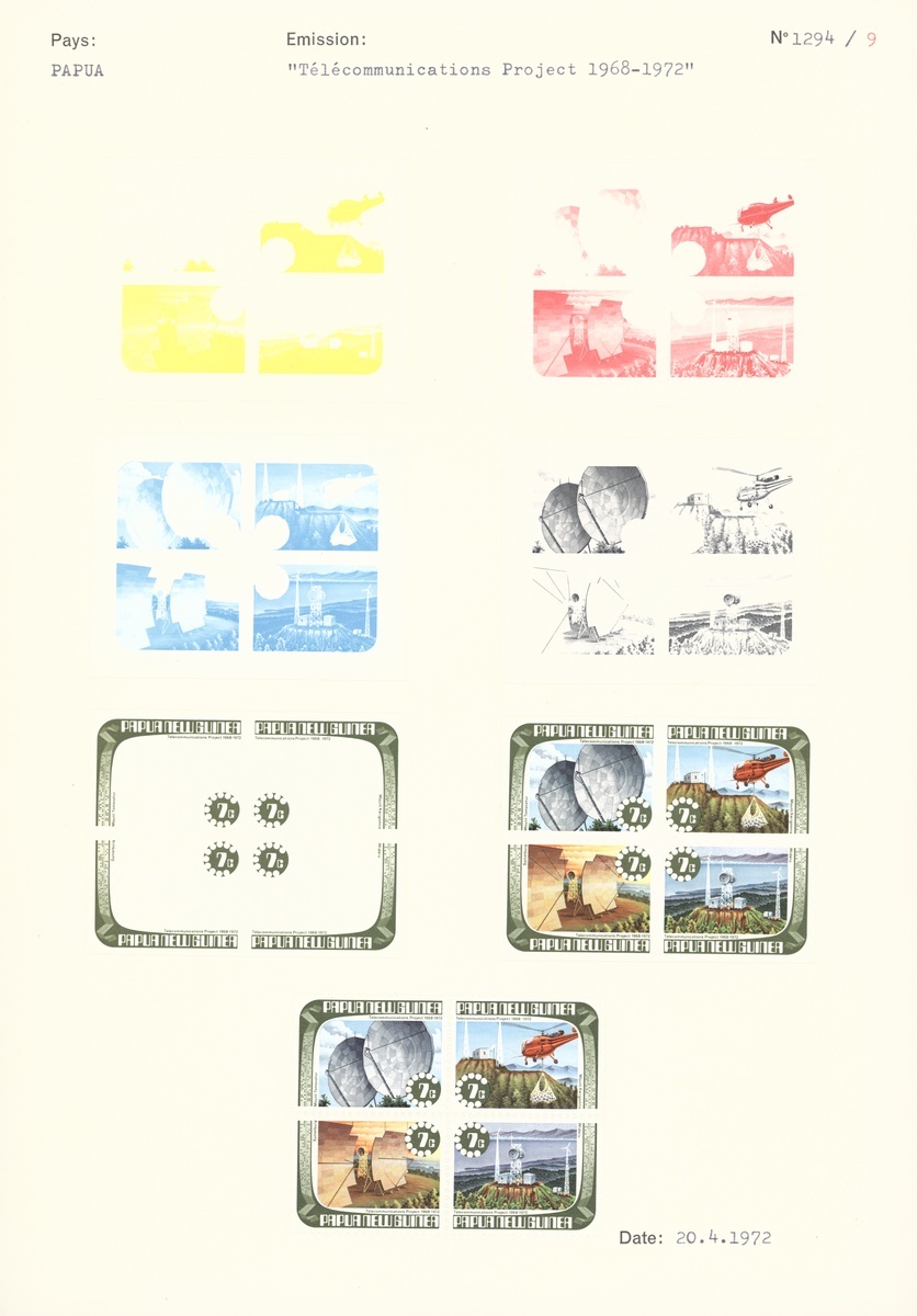 1973 (Jan.) Telecommunications Project set of six (7c. se-tenant block of four) comprising five colour separations (three for 30c.) and complete design for each, affixed to two archival pages.  (6 blocks of four and 10 single proofs)