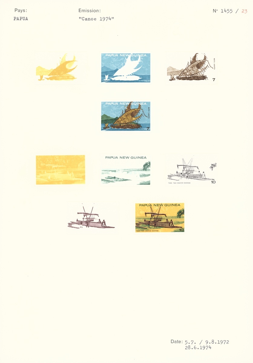 1975 (Feb.) Canoes set of four comprising four colour separations (three for 7c.) and complete design for each value, affixed to two archival pages.  (19 proofs)