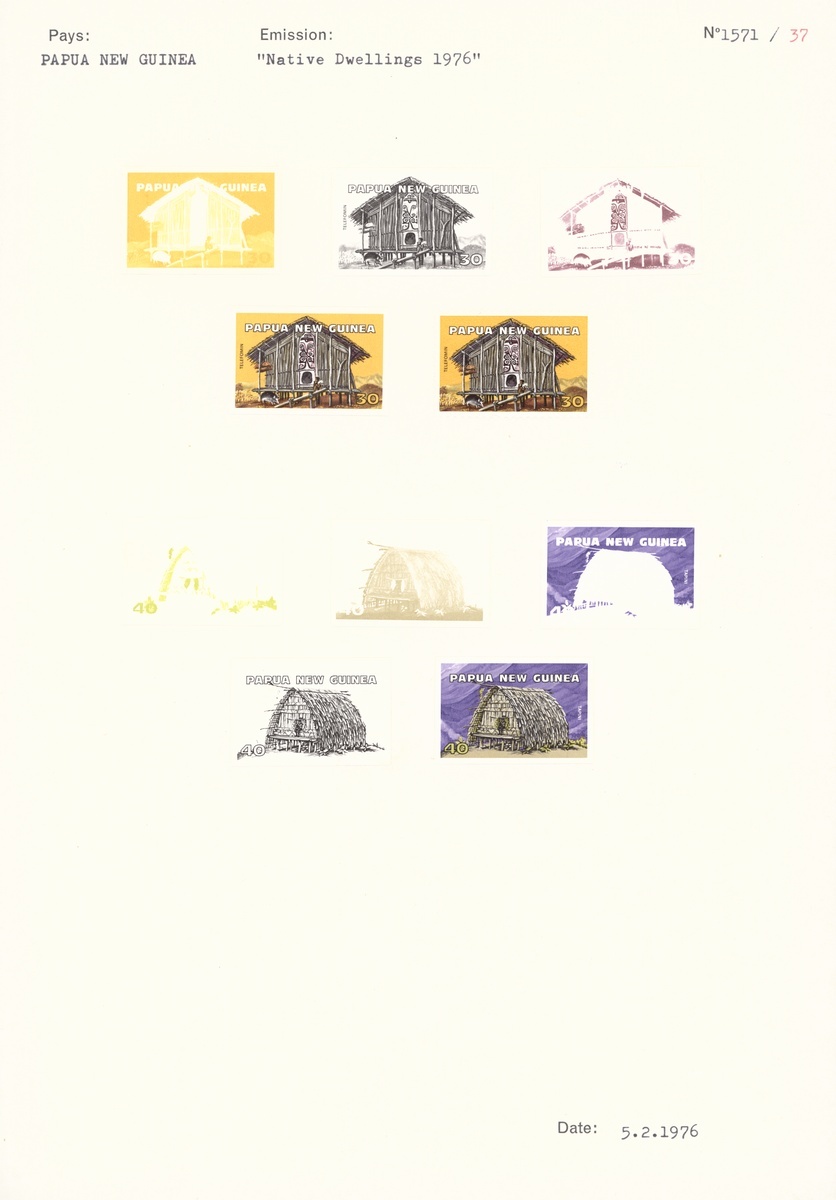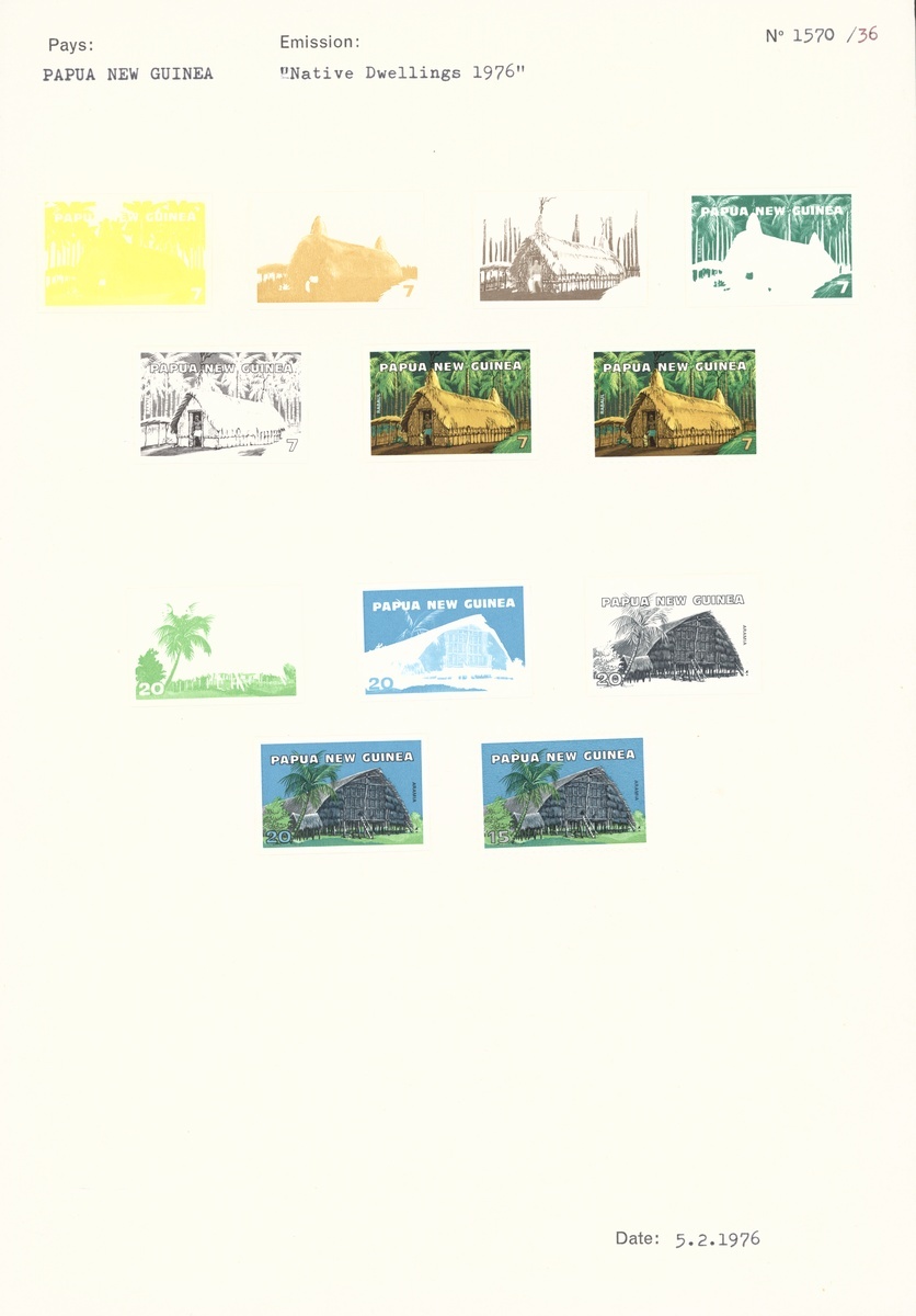 1976 (June) Native Dwellings set of four comprising colour separations (five for 7t., three for 20t. and 30t., four for 40t.) and complete design for each value, affixed to two archival pages.  (19 proofs)