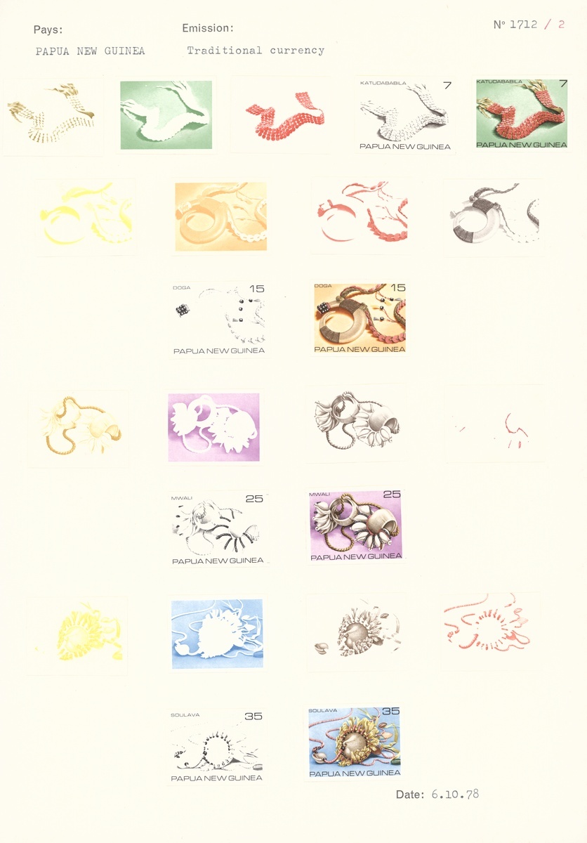 1979 (June) Traditional Currency set of four comprising five colour separations (four for 7t.) and complete design for each value. (23 proofs)