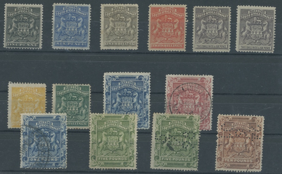 1892-93 1d., 6d. deep blue, 1/-, 2/-, 2/6d. grey-purple, 2/6d. lilac, 5/-, 10/- and £1 unused or with part original gum, £2 with fine Salisbury 1894 datestamp, £1, £5 (2) and £10 cleaned or used fiscally. Cat. £1,000+