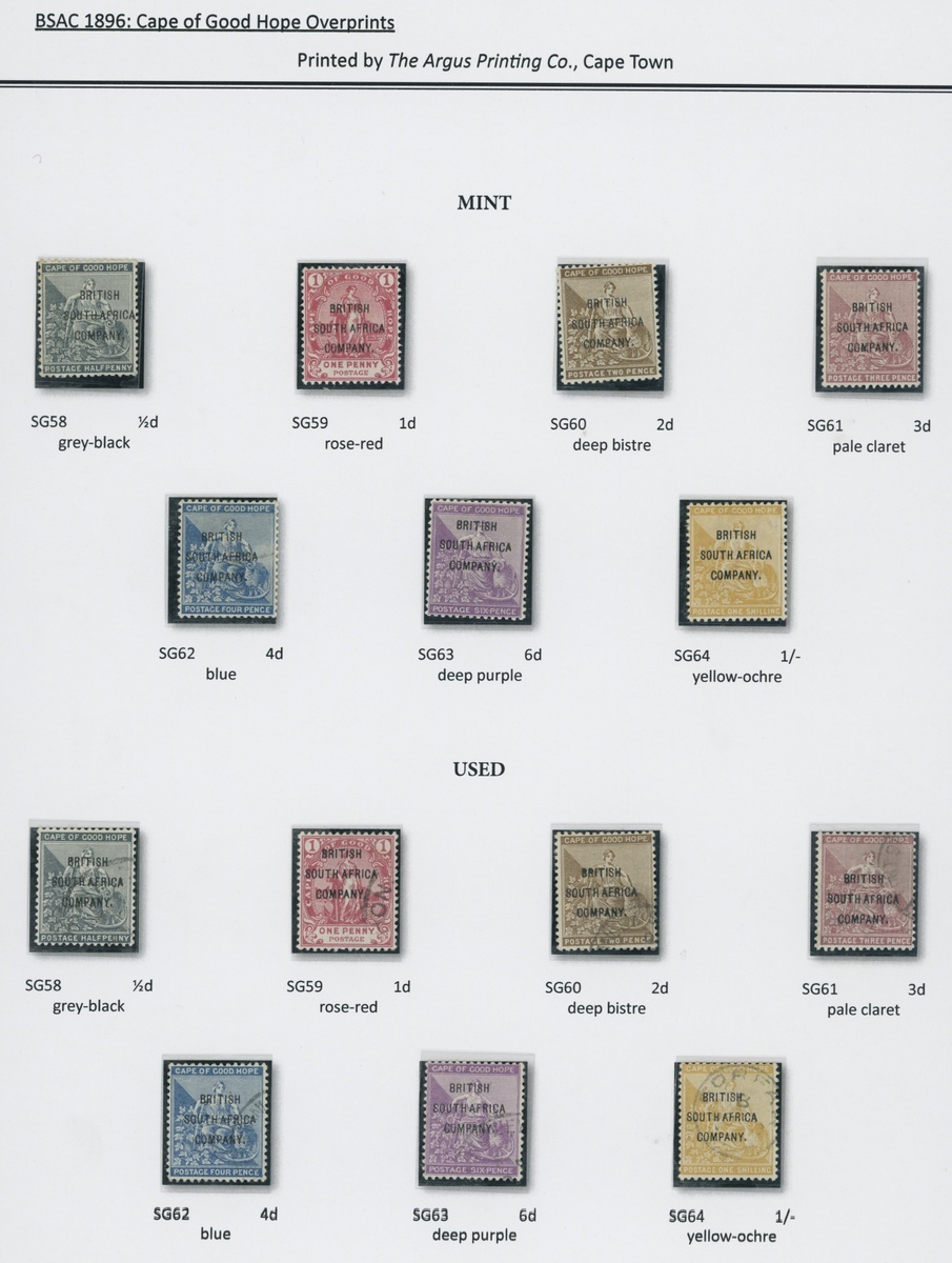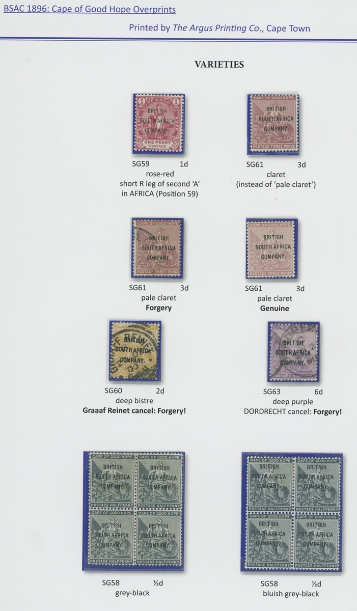 1896 on Cape ½d. to 1/- set with part original gum and used, and a few additional values including ½d. (2) mint blocks of four, 1d. and 3d. mint with minor type varieties and 3d., 6d. and 1/- with forged cancellations. S.G. 58-64
