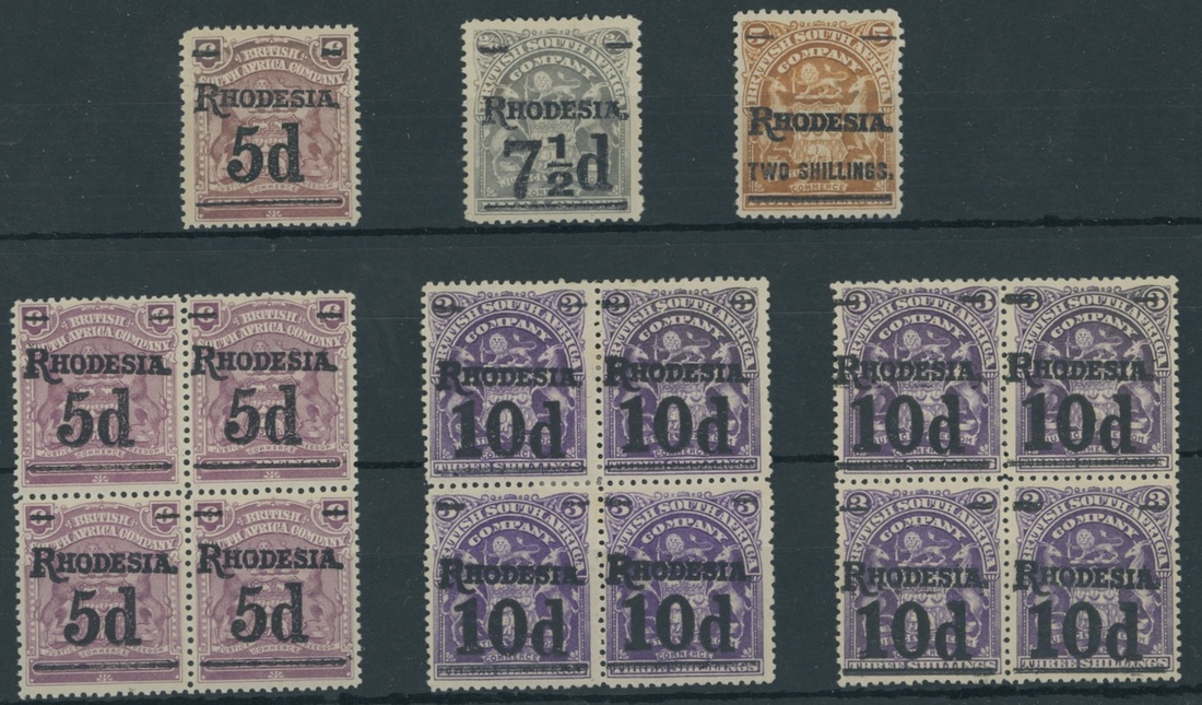 1909-12 ½d., 1d. in pair, 2½d., 3d. (2), 4d. (2, one in pair), 1/-, 2/6d. and 10/-, all variety no stop, and £1 grey-purple, and 1909-11 5d. on 6d. (5 with a block of four), 7½d. on 2/6d., 10d. on 3/- blocks of four (2) and 2/- on 5/-, mint; the 1/- variety thinned though generally good to fine