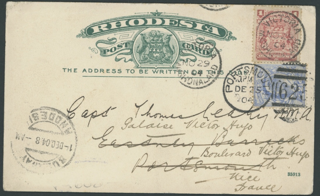 1904 (29 Nov.) picture postcard from Victoria to Portsmouth bearing 1d. red with small single-ring datestamp, upon arrival redirected to France with KEVII 2½d. blue neatly cancelled by "625" datestamp, Bulawayo transit datestamp at lower left corner; attractive and unusual