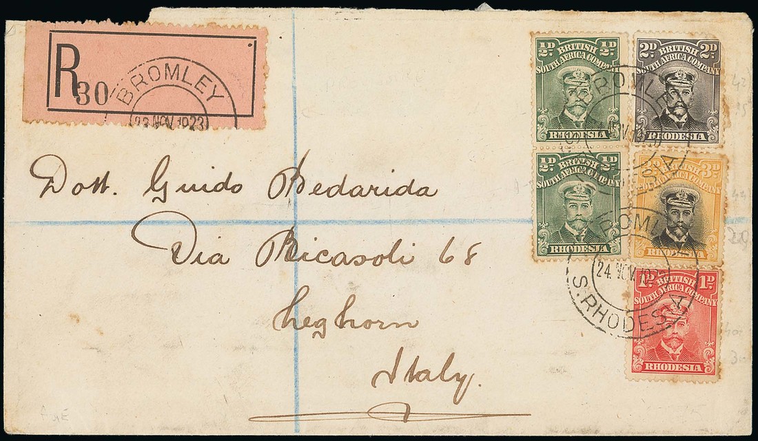 1923 (24 Nov.) envelope registered to Italy bearing Admiral ½d. pair, 1d., 2d. and 3d. sharing two DC and with the registration label pre-cancelled with the same DC, Marandellas transit datestamp on reverse; also large Arms 1d. pair with SC and Admiral ½d. with part DC. Photo cover