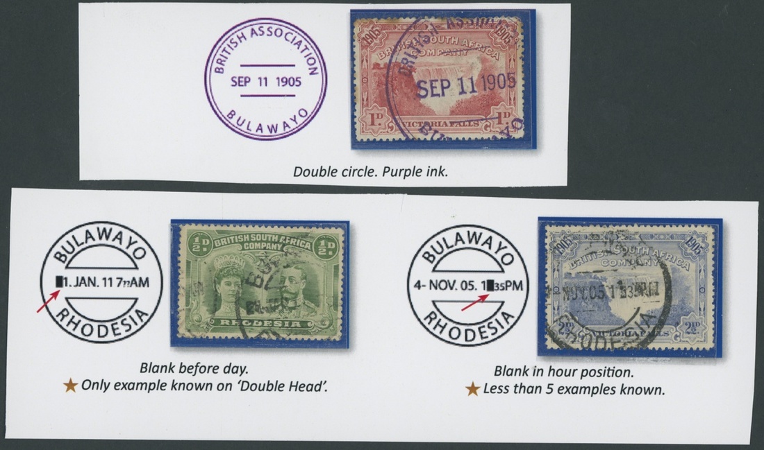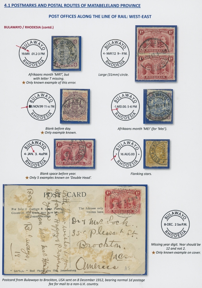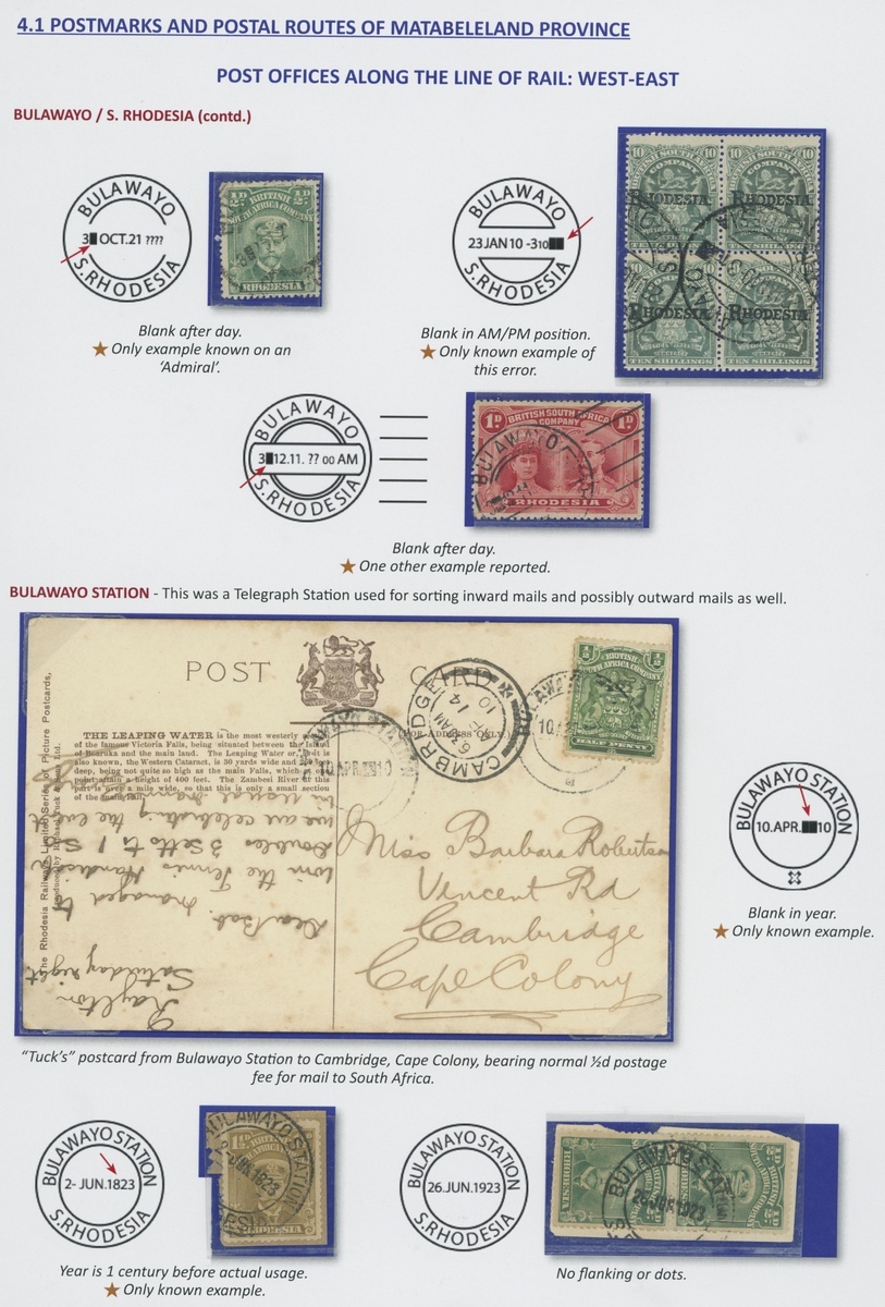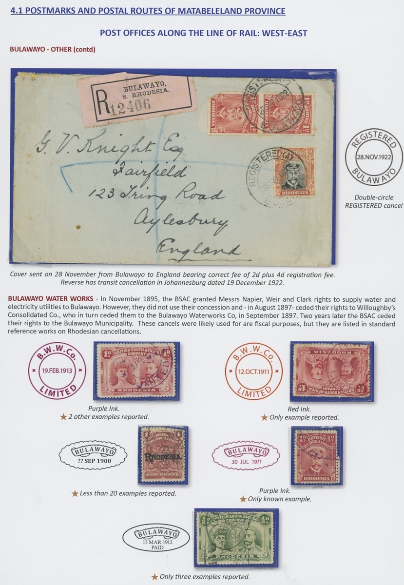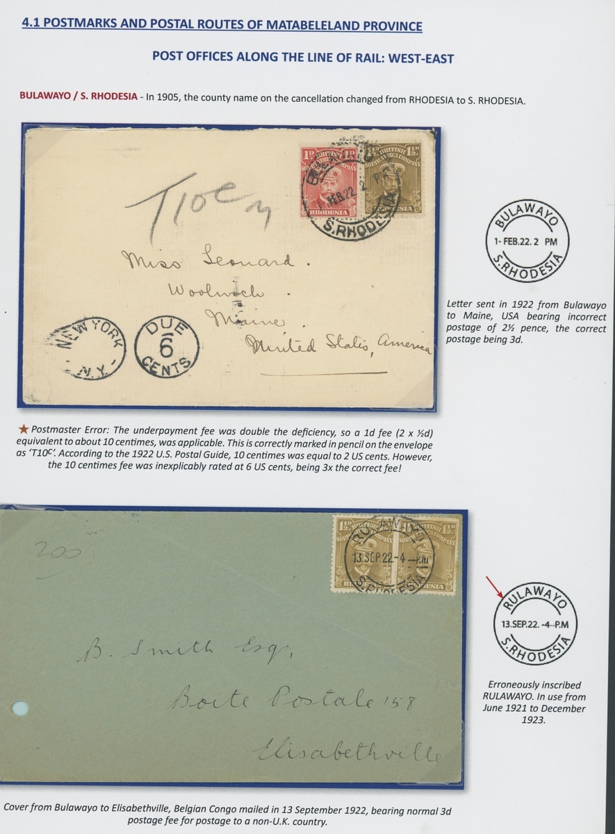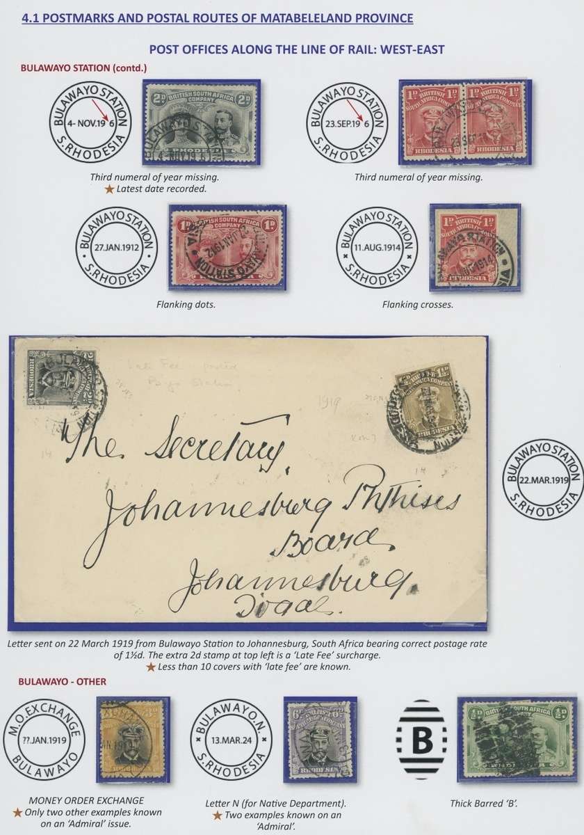 A collection of DC datestamps and other types on covers/cards (6) and loose adhesives (37), the covers/cards comprising 1910 card to Cape Colony with ½d., 1912 card to U.S.A. with Double Head 1d., 1919 envelope to Johannesburg with Admiral 1½d. and 2d. for Late Fee, 1922 cover to U.S.A. franked at 2½d., 1922 envelope to Belgian Congo bearing Admiral 1½d. pair and 1922 envelope registered to England franked at 6d., some with Station datestamps and other types include "B" in oval of bars, "