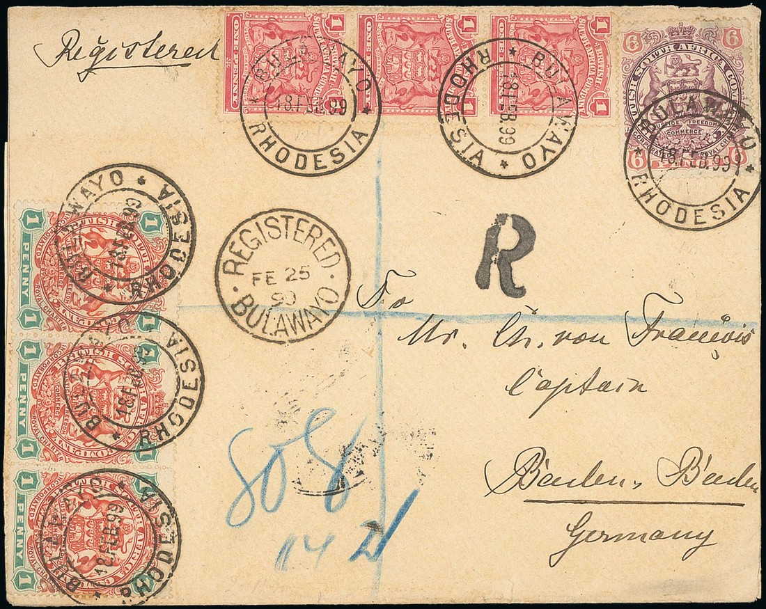 1890 (19 Feb.) envelope registered to Germany, bearing Large Arms 1d. (3) and 6d. and Arms 1d. (3) all with DC datestamps, also showing Registered SC datestamp date a week later on the 25th. and with "R" handstamp alongside; the registration datestamp apparently applied late due to the fact that the cover was under-franked by ½d. and the time it took for the post office to decide to lose ½d. Photo