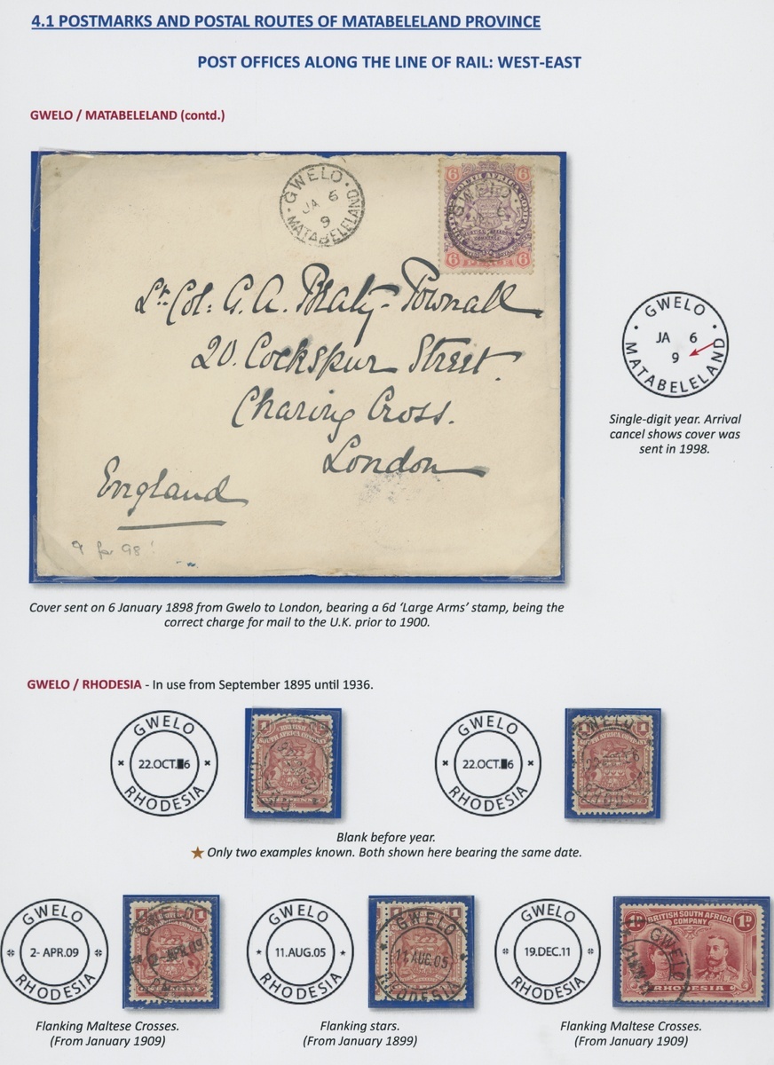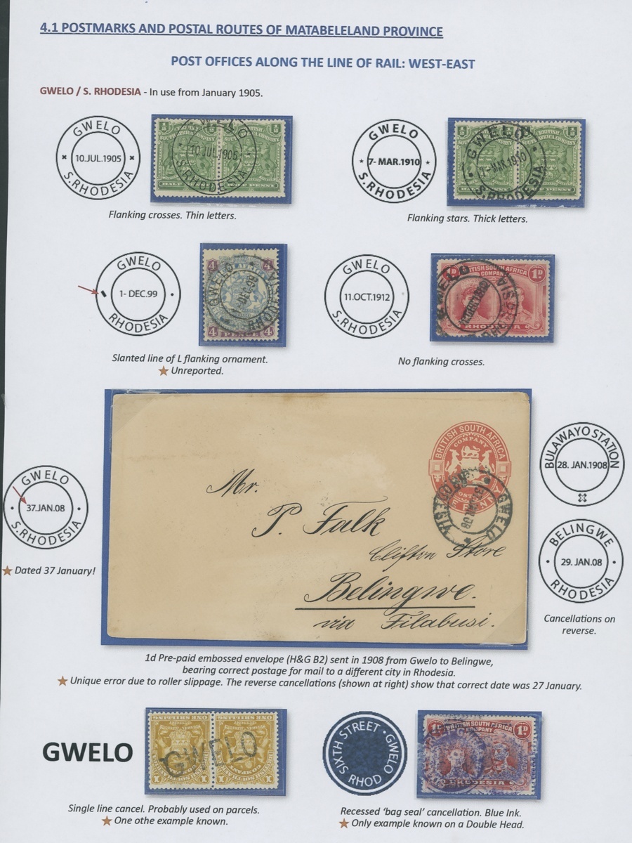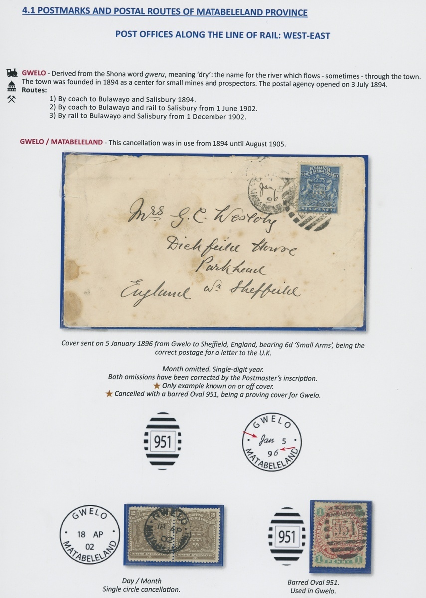 1896 envelope to England bearing 6d. blue cancelled "951" and by SC Matabeleland type with part date in manuscript, 1898 envelope to London bearing Large Arms 6d. cancelled by SC Matabeleland type, 1908 1d. envelope "via Filabusi" to Belingwe with fine DC, and some loose adhesives (13 items) with "951", SC, DC selection, two "