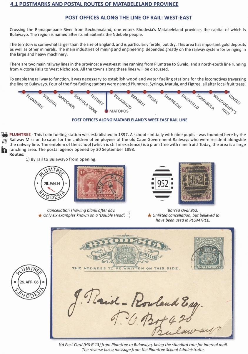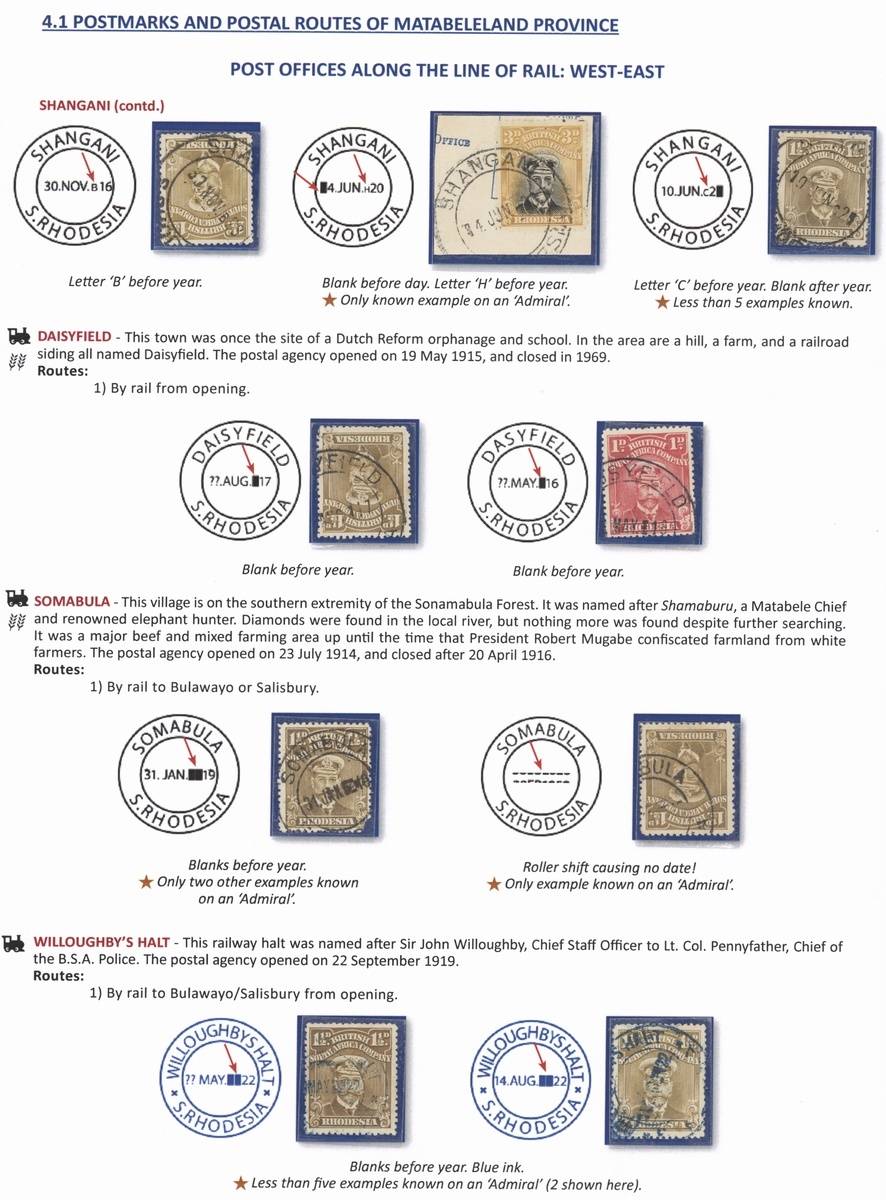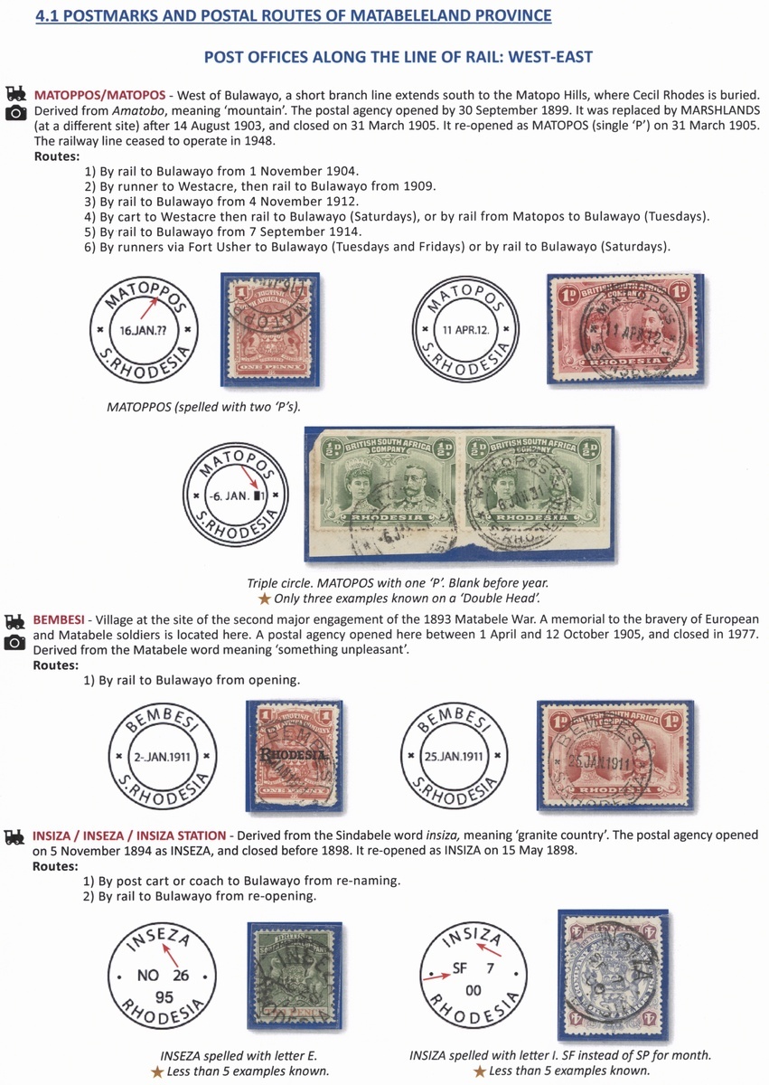 A selection of thirty-five loose values/pieces on a variety of values and a card covering 11 Offices (no Bulawayo) from Plumtree to Willoughby's Halt, including Plumtree "952" and 1906 card to Bulawayo, Matopos (3), Insiza (2, one spelt "