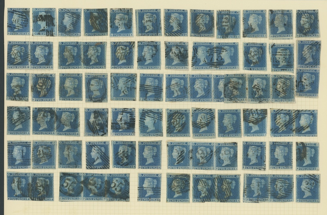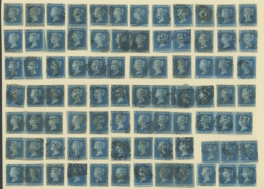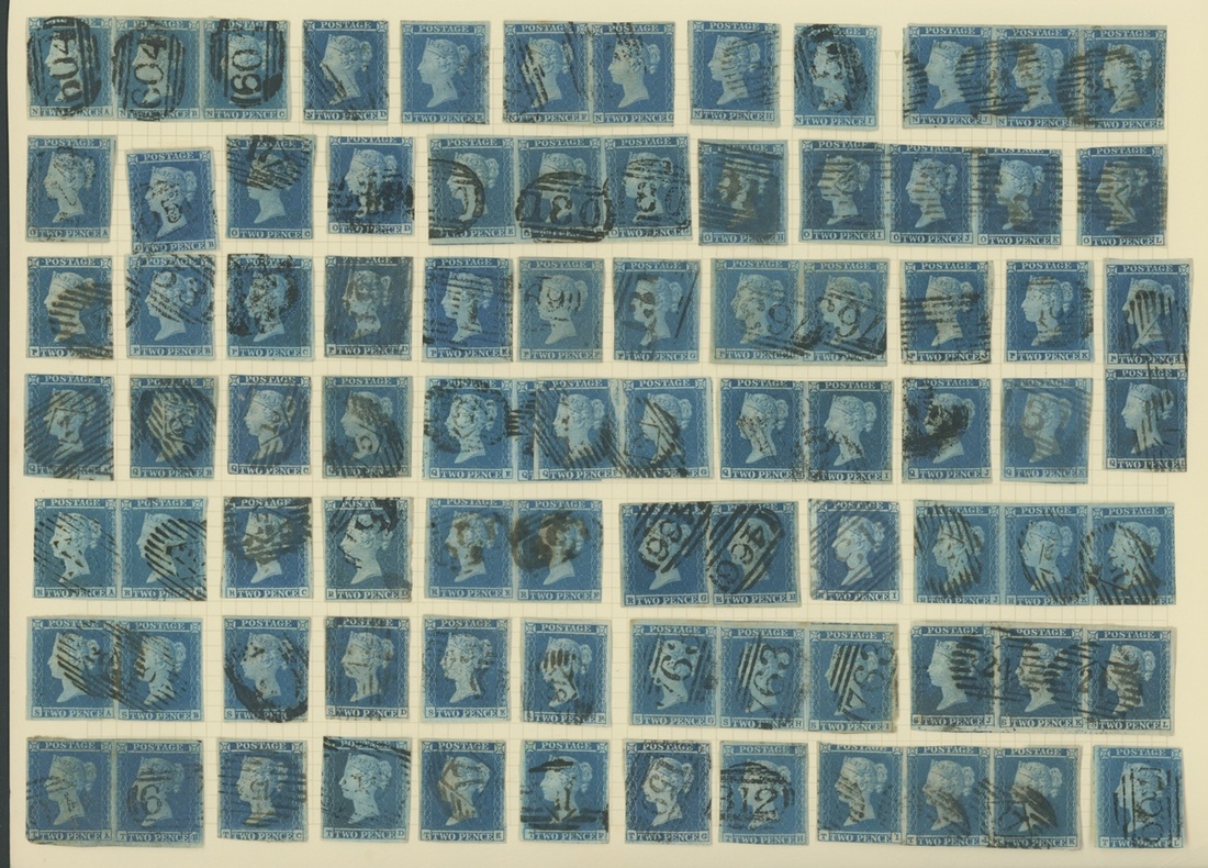 A complete used plate reconstruction, comprising singles (123), pairs (32) and strips of three (18), mostly three or four margined, the majority with neat or light strikes of black numeral cancellations; condition somewhat mixed though a number of fine and very attractive examples included. Very rare. Cat. £21,600