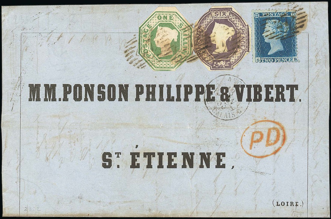 2d. blue, Plate 4: SB, used with 1847-54 embossed 1/- and 6d. (both cut to shape but with practically clear margins), tied by London Inland Section "27" barred numeral cancellations to wrapper, no side flaps, to France, red
