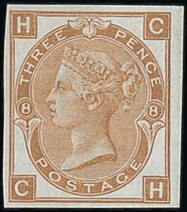 3d. Plate 8: imperforate colour trial in olive-brown lettered CH on watermarked paper, original gum; fine and scarce. Specialised £2,500. Photo