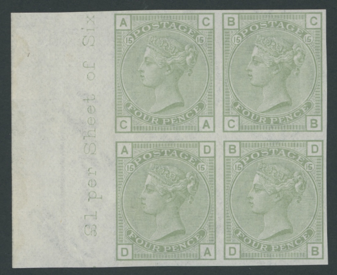 4d. light sage colour trial Plate 15: CA-DB, imperforate block of four from the left of the sheet, unmounted mint, showing part sheet inscription; scarce and very fine. S.G. 152var