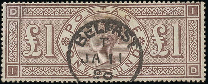 £1 brown-lilac, ID cancelled by a central strike of Belfast c.d.s. A very attractive example of this stamp. S.G. 186, £4,500. Photo