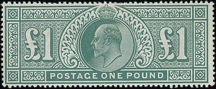 £1 dull blue-green, large part original gum; small tone spot on the reverse and dealer's guarantee handstamp. S.G. 266, £2,000. Photo